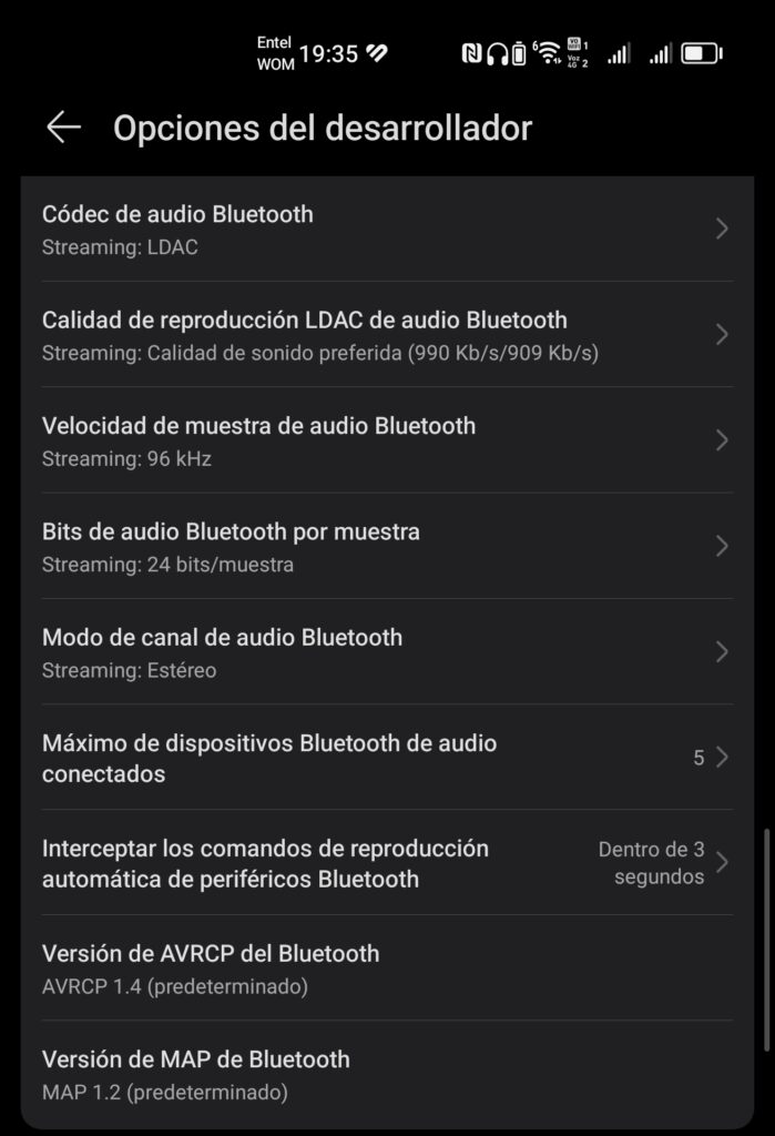 Más abajo verás la opción “Códec de audio Bluetooth”, acá simplemente te mostrará el códec de audio que se está utilizando en ese momento. En mi caso se está usando el LDAC que nos ofrece audio Hi-Res, aunque ojo, no todos los smartphones son compatibles con este códec.