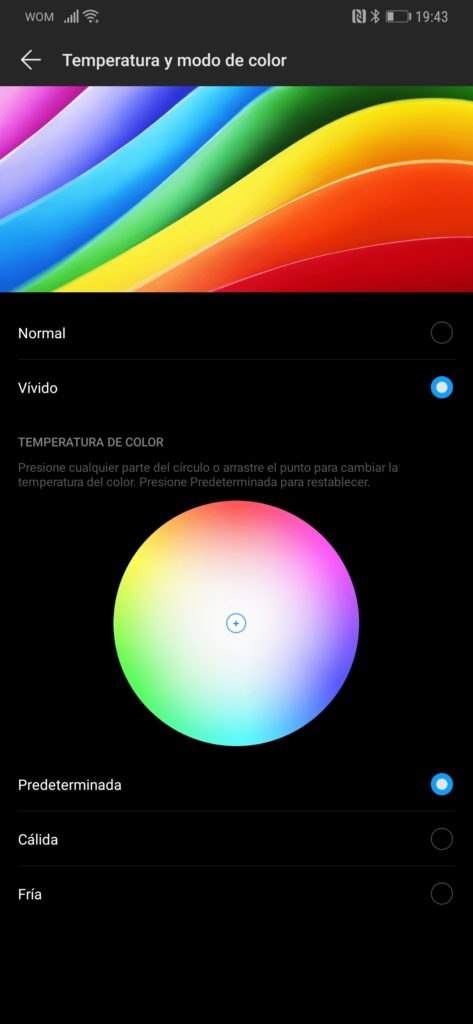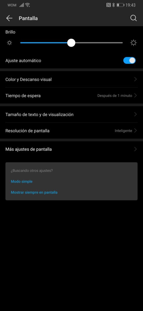 En las opciones disponibles podremos controlar el nivel de brillo, la temperatura de la pantalla y el modo de color (normal o vívido), así como también modificar el tamaño del texto y de la interfaz y modificar la resolución entre HD+, FHD+ y WQHD+, pero además agregar la opción «Resolución inteligente» que irá modificando la resolución de acuerdo a la energía restante.