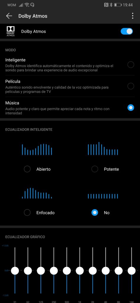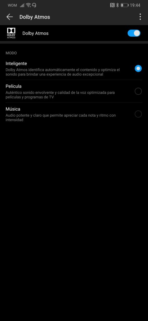 Al acceder a la App de Dolby Atmos nos encontraremos con tres modos: «Inteligente», «Películas» y «Música». El primero adaptará la calidad de audio de acuerdo al tipo de contenido que estemos escuchando, el segundo es ideal para ver nuestras películas y/o series, mientras que el tercero es para nuestra música. De hecho cuando seleccionemos esta última opción accederemos a un «ecualizador inteligente» el cual trae tres perfiles pre-ecualizados, pero de igual manera podremos modificar dicho ecualizador a nuestro gusto con sus 10 bandas.