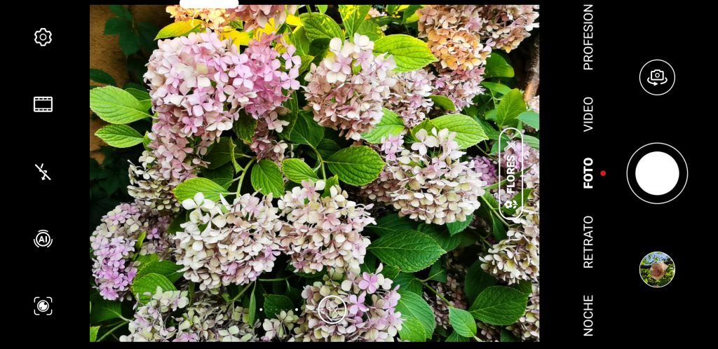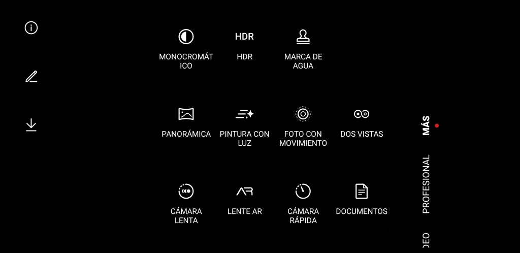 Por el lado derecho nos encontraremos con los modos de captura, en donde destacan Apertura, Noche, Retrato, Foto, Video, Profesional, y Más. En este último vamos a poder elegir Foto con movimiento, el clásico Pintura con luz, Panorámica, Lente AR, Cámara rápida, escáner de documentos, modo HDR, modo monocromático, y el modo Cámara lenta, el cual en este Mate destaca porque ofrece grabar a 7680 cuadros por segundo para un resultado espectacular que verás más abajo.