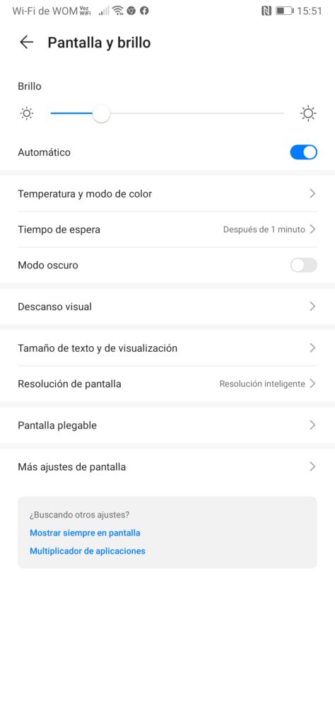 - Brillo y resolución: Brillo automático, resolución Full HD+ (resolución activada desde fábrica.