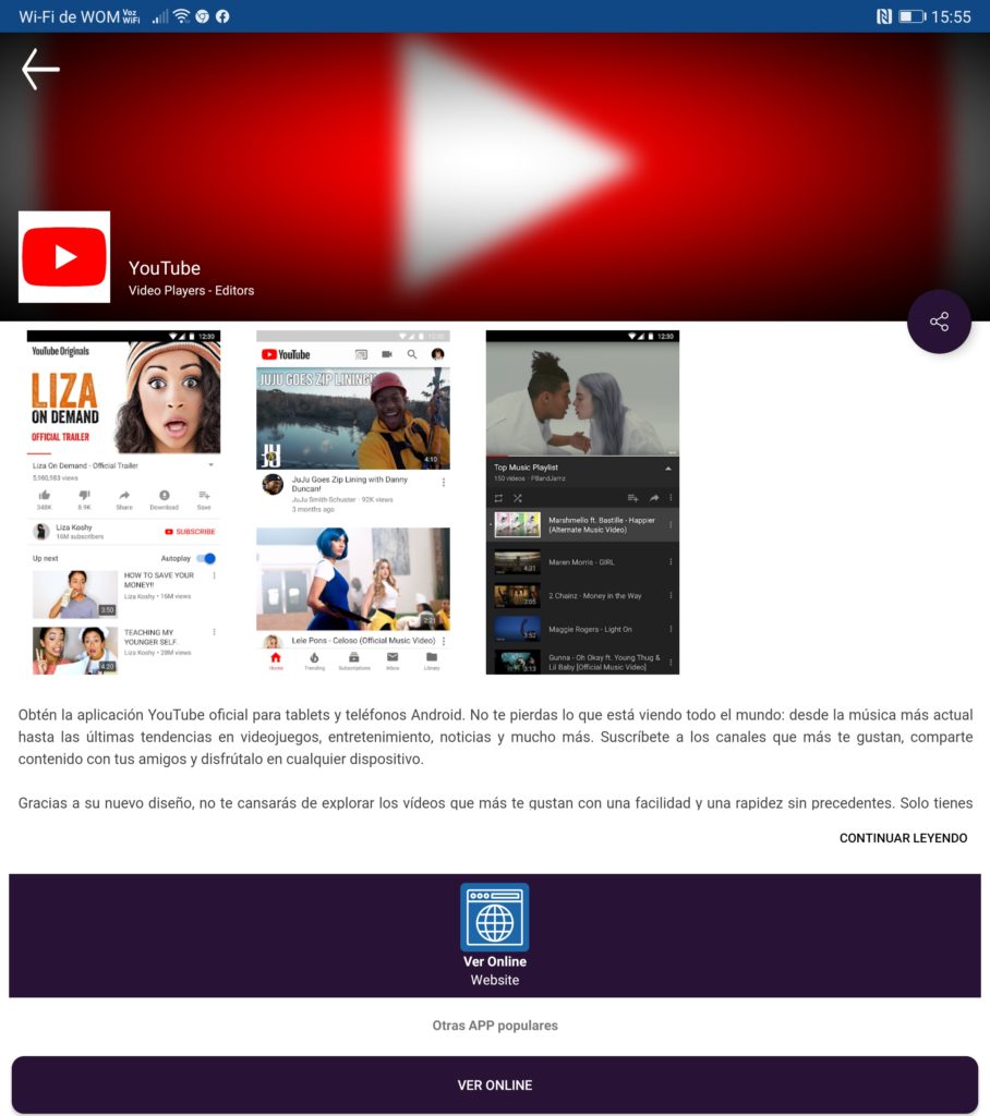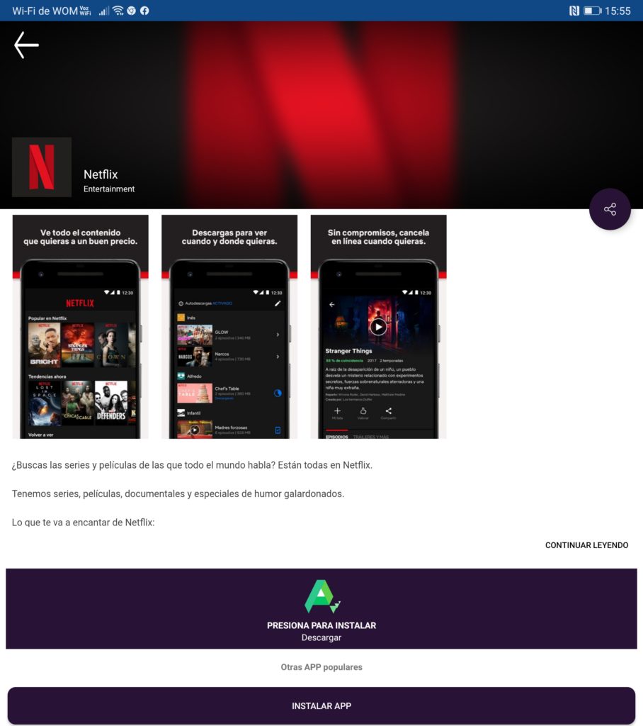 Obviamente ahí encuentras las aplicaciones de Google, por darte un ejemplo, aunque las que necesitan los servicios de Google para funcionar (Google Play Services) como Gmail, la app solo te ofrecerá una “App web” que es como un acceso directo a su versión web. Lo mismo pasa con YouTube, pero si descargamos otras como Netflix, ahí descargaremos el APK directo, tal y como lo demuestran las capturas: