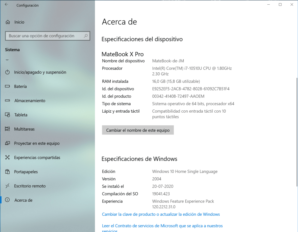 En cuanto a conectividad inalámbrica, tenemos Wi-Fi IEEE 802.11 a/b/g/n/ac con soporte 2.4 y 5 GHz 2×2 MIMO. También tiene Bluetooth 5.0 y NFC para ser usado con la función Huawei Share de la que te hablaré más adelante. Todo lo anterior es controlado por Windows 10 Home en su versión 2004.