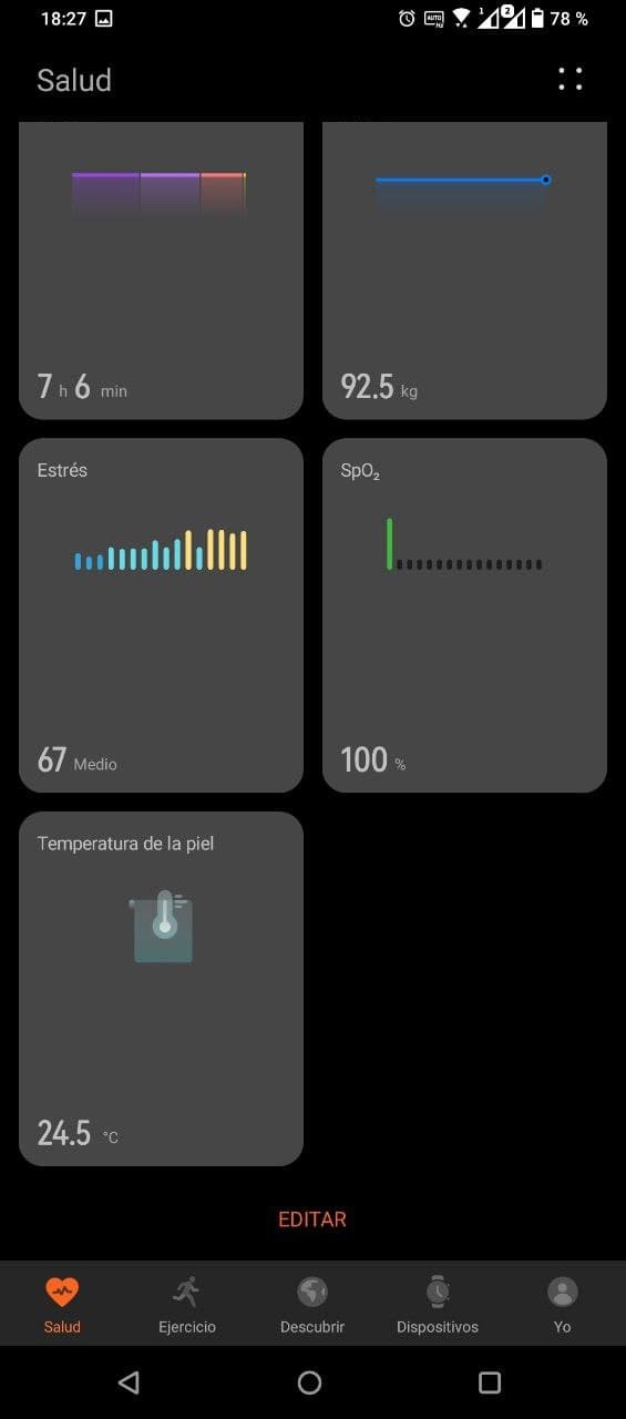 De todas maneras, la aplicación cumple con lo esencial para comprobar las funciones de salud como el pulso, pasos, sueño, estrés y más. Esto está contenido en la primera pestaña llamada “Salud”.