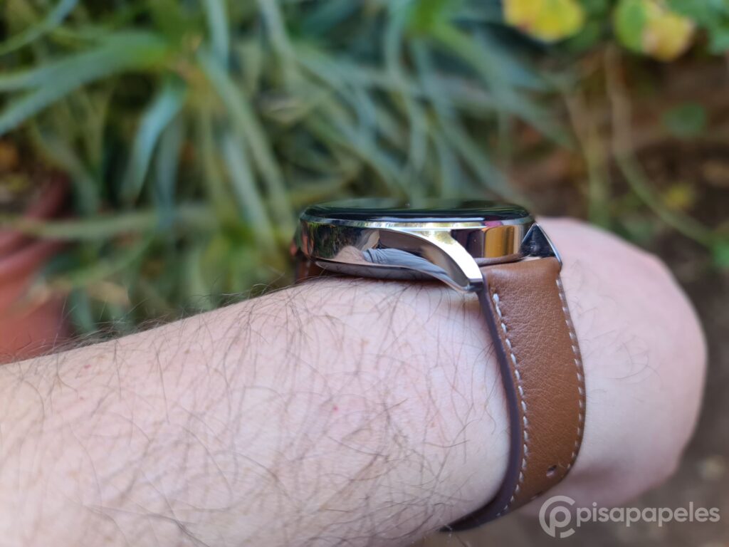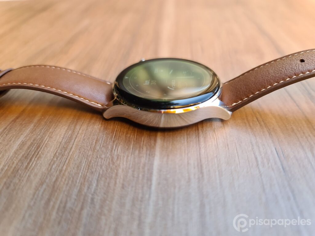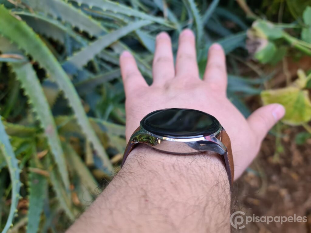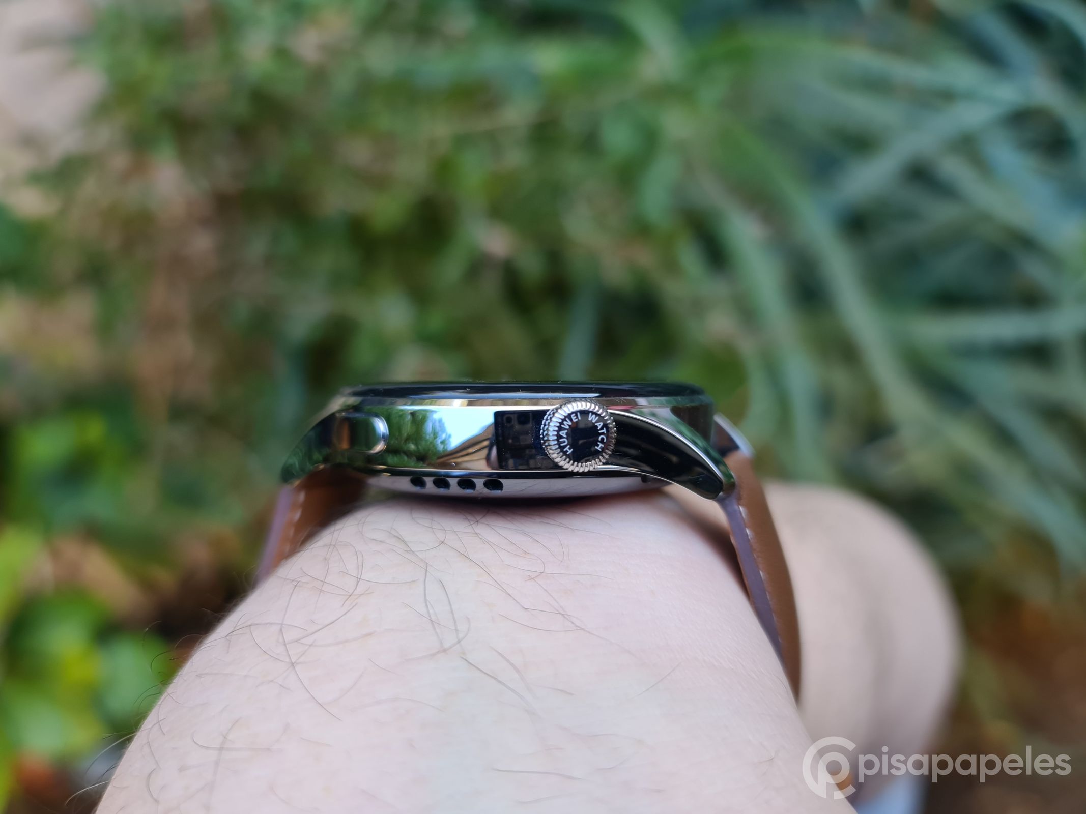 Actualmente hay dos versiones de este reloj, es decir, una con correa de silicona y otra con correa de cuero como el que estamos revisando. La edición con correa de cuero posee un diseño muy sobrio y elegante, e incluso tienes detalles grabados como la marca en la hebilla y el modelo en la corona. Su aspecto es bastante similar a un reloj tradicional, lo cual es bueno para no perder el foco del dispositivo que estamos usando. Al colocarnos el reloj este no molesta en lo absoluto debido a su bajo peso y delgado grosor, ajustándose perfectamente a mi muñeca. Su construcción está hecha de acero inoxidable más un recubrimiento cerámico para la parte frontal y trasera.
