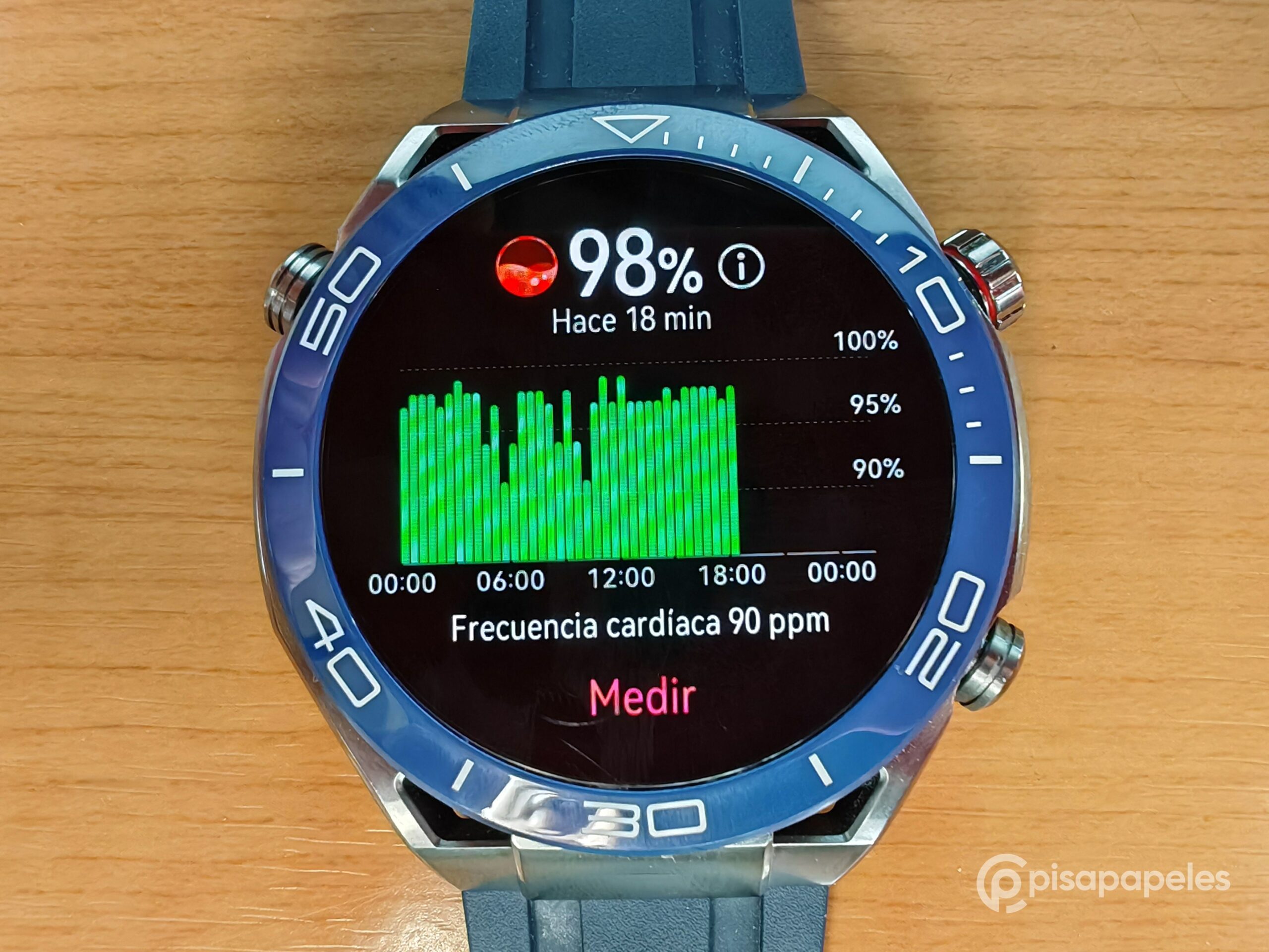 El Watch Ultimate tiene la capacidad de ir registrando tu nivel de oxígeno en la sangre de manera manual o automático. También te enviará alertas cuando detecte que tienes un nivel de 80% o menos de oxígeno en la sangre, aunque también puedes elegir que lo haga cuando tu nivel alcance los 90, 85, o 75%.