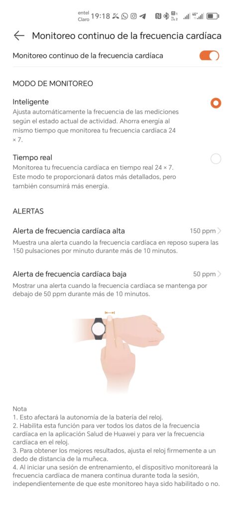 Y al igual como en otros dispositivos, podrás activar alertas para cuando el reloj detecte una alta o baja frecuencia cardiaca.