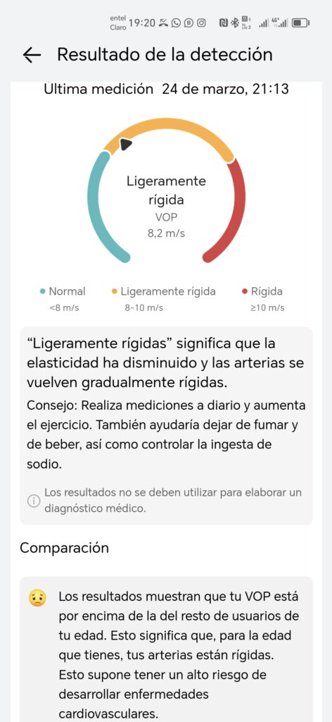 En mi caso, pues parece que tendré que visitar el médico pronto, ya que el reloj me detectó que la rigidez arterial está “ligeramente rígidas”, y eso se debe a que personalmente no hago mucho ejercicio y mi subida de peso. De hecho, la app me recomienda que aumente los ejercicios, aunque también me recomienda dejar de fumar y beber, cosa que no hago por suerte. Sin embargo, esto deja claro que estoy con un alto riesgo de desarrollar enfermedades cardiovasculares, así que, terminando el review pediré hora al médico.