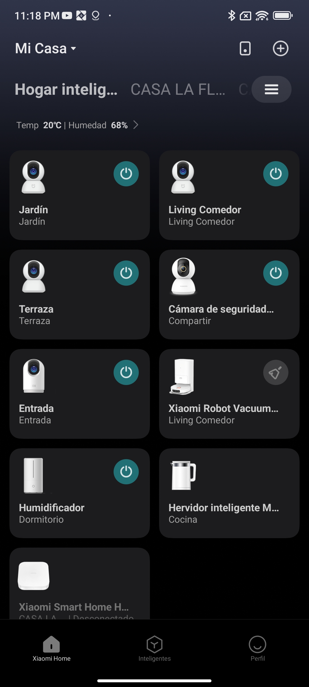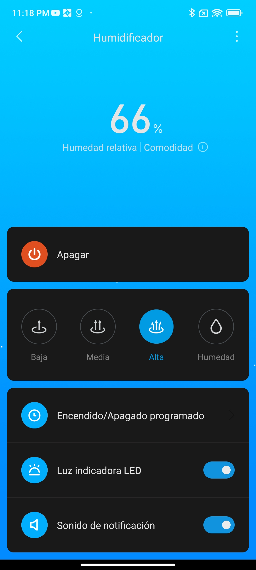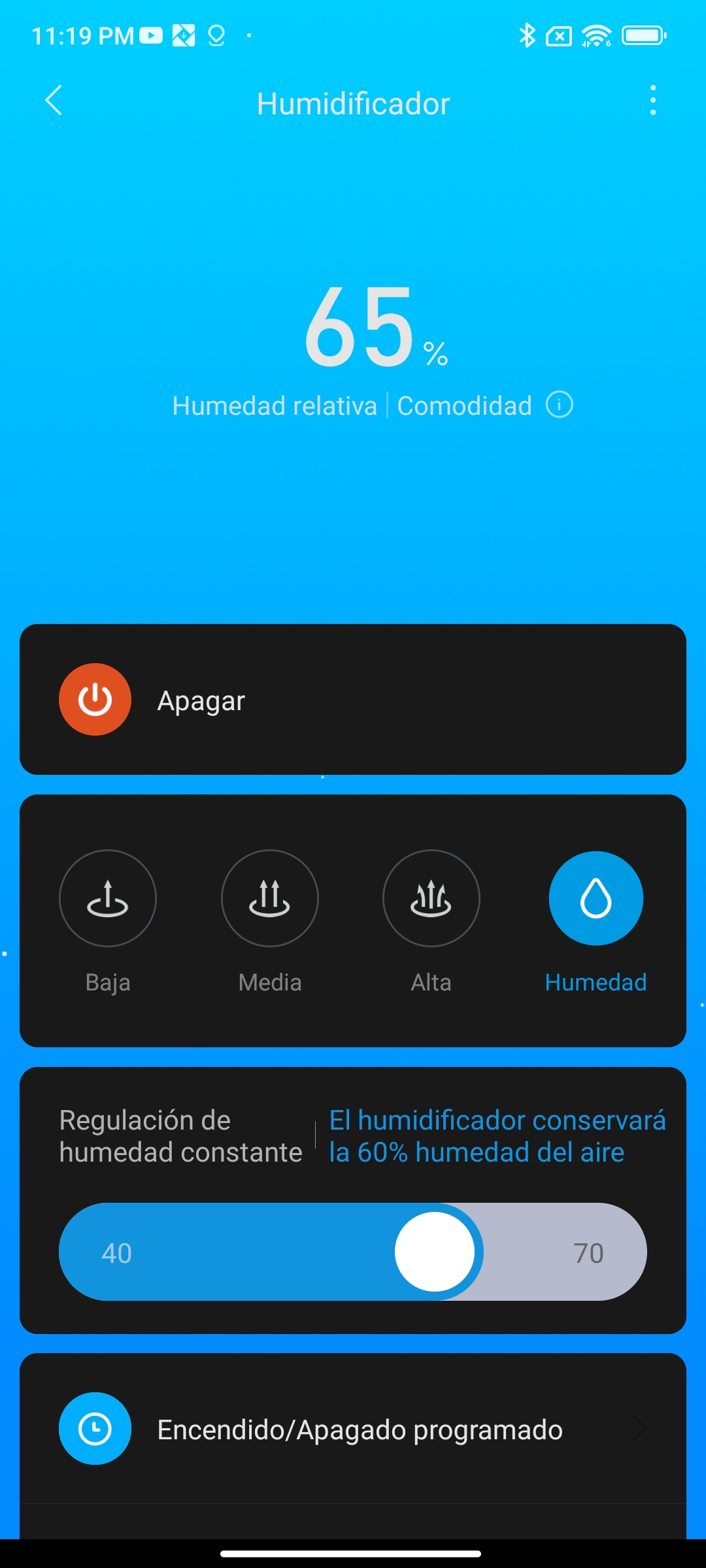 Cuando lo conectamos a la app Mi Home, lo primero que verás será el nivel de humedad que existe en la habitación. En mi caso hay un 64% de humedad, lo que equivale a un nivel de “Comodidad”.