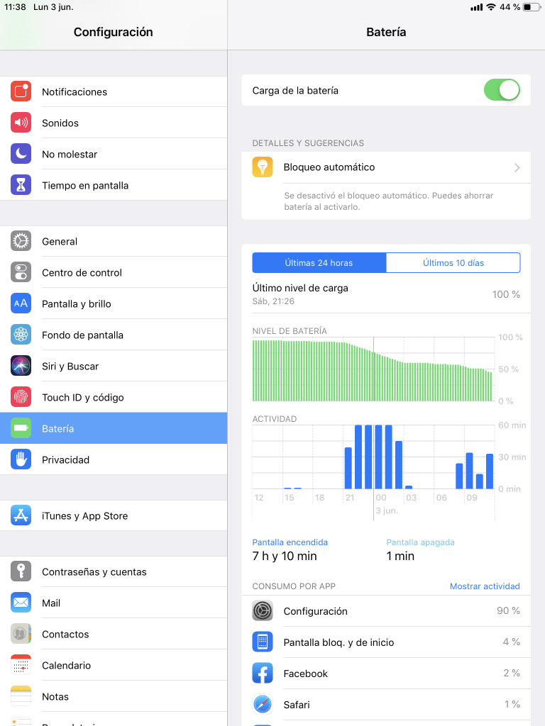 Instalé variadas aplicaciones y también usé el iPad con conectividad 4G en algunas ocasiones. Con el uso descrito anteriormente, me entregó una duración total de 11 horas aproximadamente con un uso intensivo. Sin embargo, si el uso es moderado, perfectamente puede durarte por un par de días, como lo demuestra la siguiente captura: