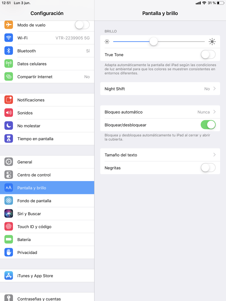En cuanto a los ajustes que tenemos disponibles para la pantalla, son pocos, ya que solo podremos modificar la intensidad del brillo, activar la función Night Shift (que cambia la tonalidad de la pantalla en la noche a un tono cálido para descansar la vista), modificar el tiempo para el bloqueo automático, así como también modificar el tamaño del texto.