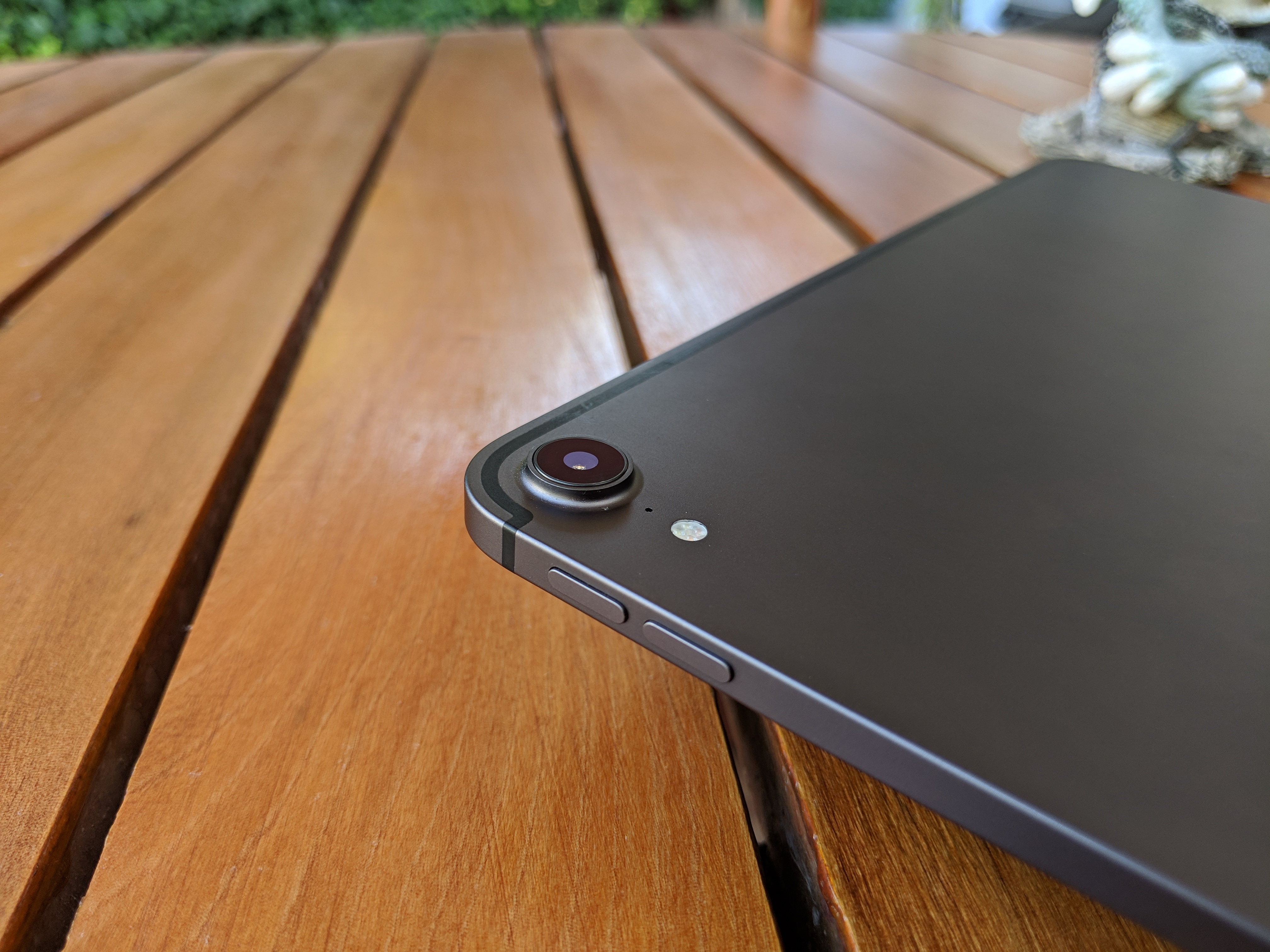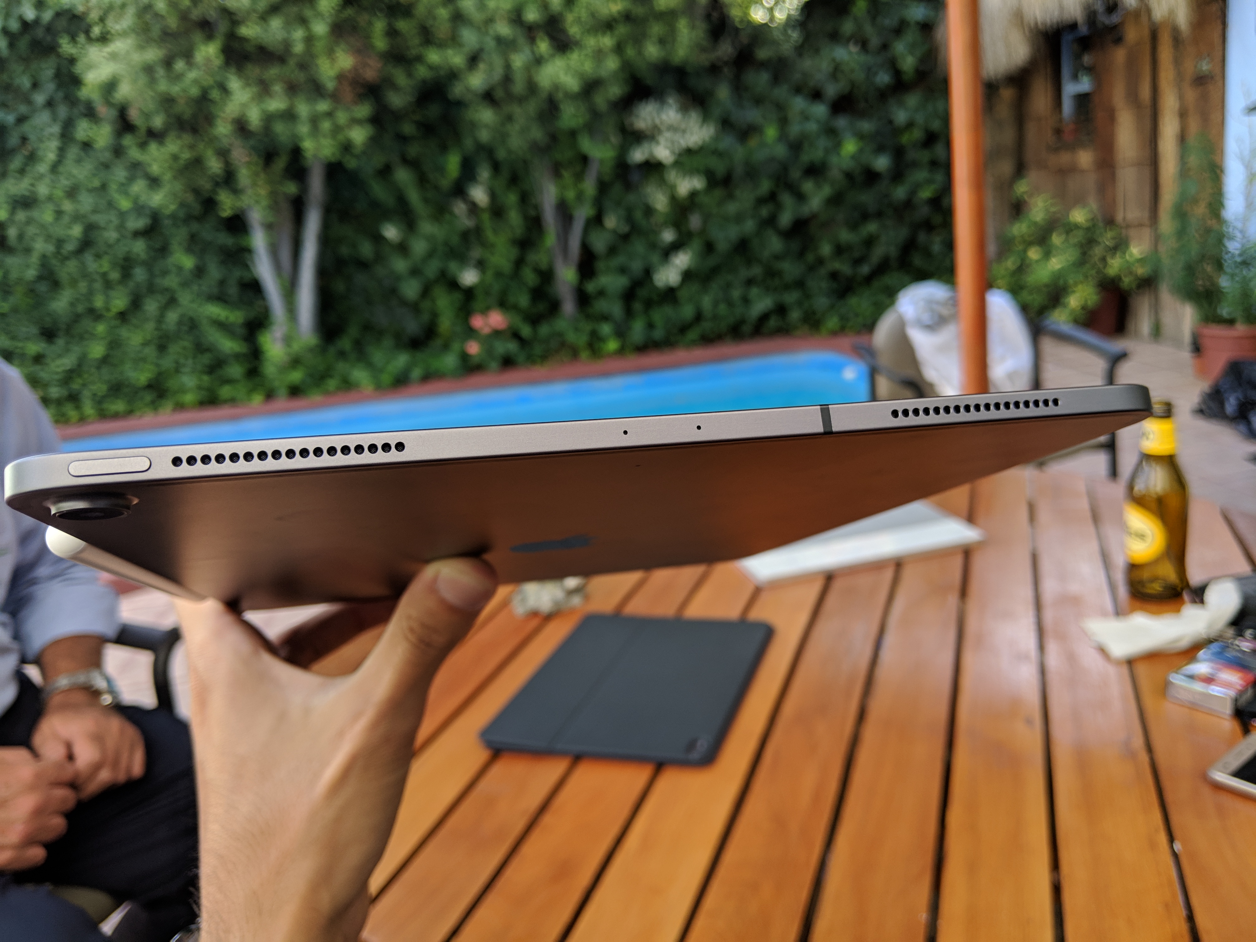 En la parte de atrás contamos con unos pins de conexión magnética que permiten sincronizar el Smart Keyboard Folio, además de su cámara y la clásica manzana de la empresa, mientras que en los costados contamos con botones de volumen y un montón de imanes para el Apple Pencil y el teclado. En la parte superior también tenemos un botón para encender el iPad y activar Siri, como el cualquier iPad o iPhone. Y también, tal y como ocurre en los últimos teléfonos de la empresa, el jack de audífonos no está presente, lo que a esta altura no debería preocupar a nadie.
