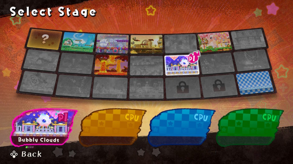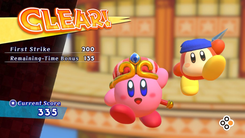 El total de escenarios que tenemos en el juego son 20, todas basadas en el mundo de Kirby y muy bien ambientadas, donde podremos ver personajes entrañables como Krako, Lololo y Lalala o Dedede hacer apariciones espontáneas en alguna etapa. Como consejo, recomiendo utilizar los esquives aéreos direccionales apretando el botón R en el aire tal cual en Smash Bros. En tierra, si apretamos dicho botón, tendremos un escudo normal, y si lo hacemos en tierra, tendremos un esquive igual pero en el suelo. De esta manera, podremos esquivar bastantes ataques y progresar de manera más rápida.