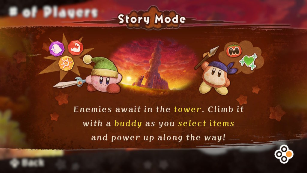 El modo historia, es quizás en el que muchos se van a centrar, y su funcionamiento es bastante simple, pues se trata de subir una torre piso por piso derrotando distintos enemigos junto a un compañero, que si no tenemos un amigo para jugar de manera local, será una CPU que nosotros elijamos. En un principio será solo Bandana Dee, pero a medida que progresemos podremos ir desbloqueando más compañeros como Gooey y Magolor, además de Kirbys con distintas habilidades.