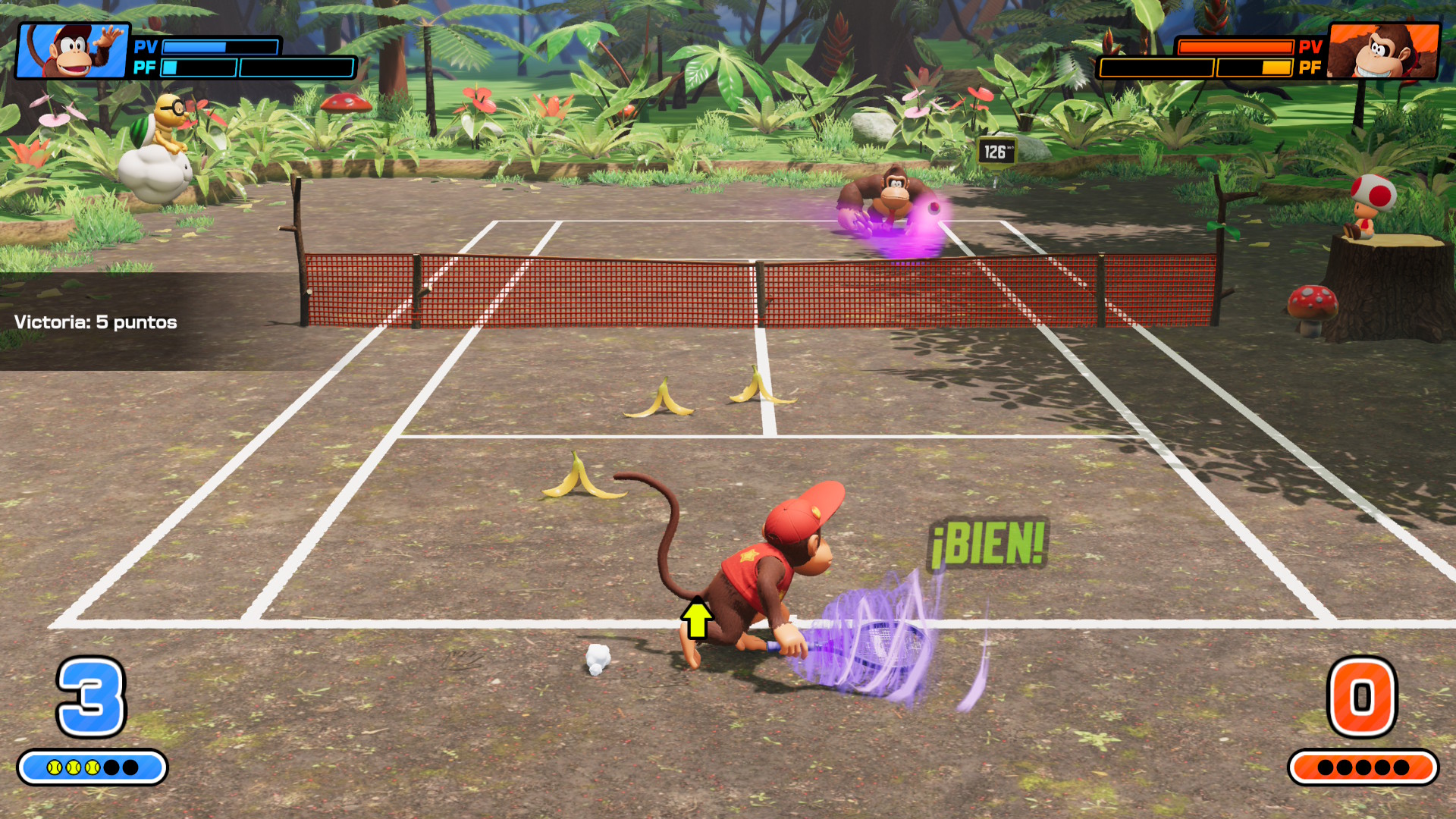 Eso sí, cada personaje tiene fortalezas y debilidades distintivas en la cancha. Chain Chomp, por ejemplo, imparte potencia impresionante a sus golpes pero no puede generar spin efectivo. Dry Bones es más débil pero ágil en la cancha y capaz de producir curvas devastadoras en sus drop shots. Es por eso que experimentar con cada personaje resulta divertido mientras encuentras aquellos que se adaptan a tu estilo de juego.