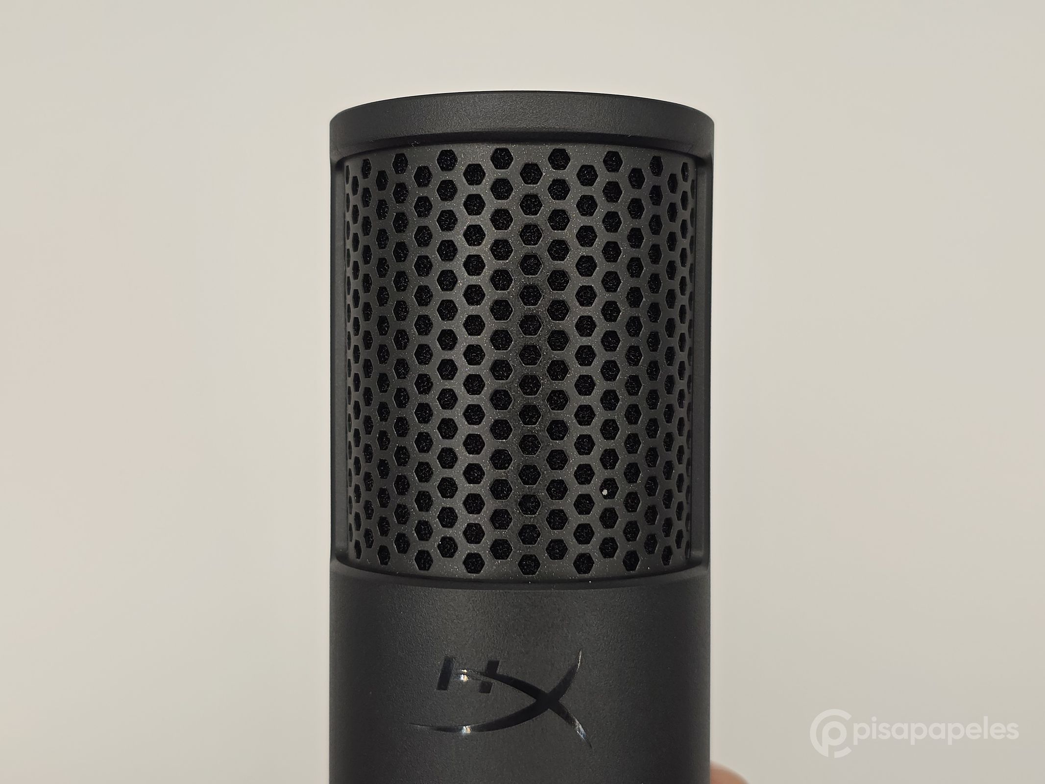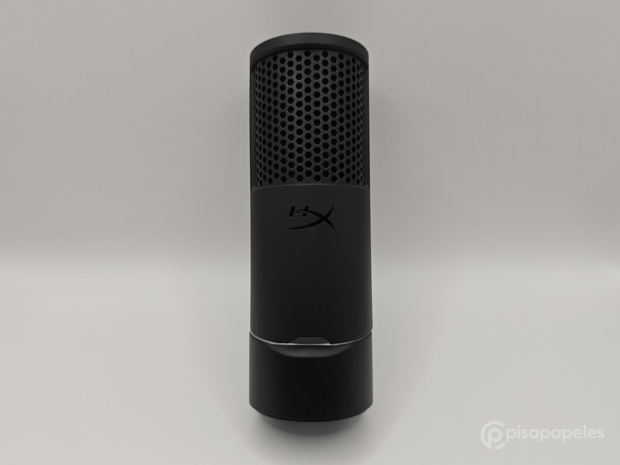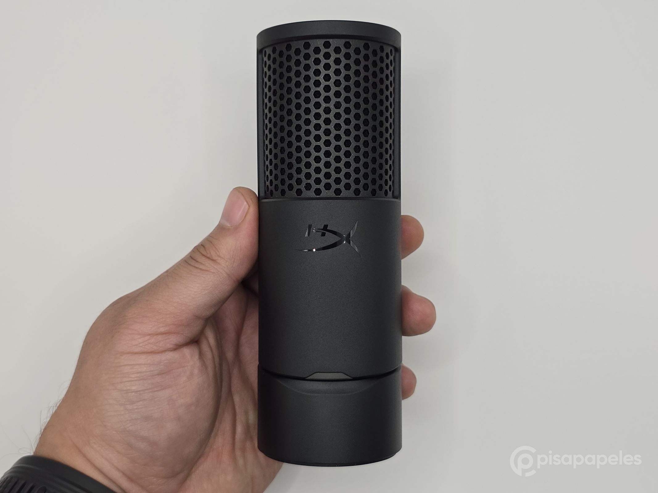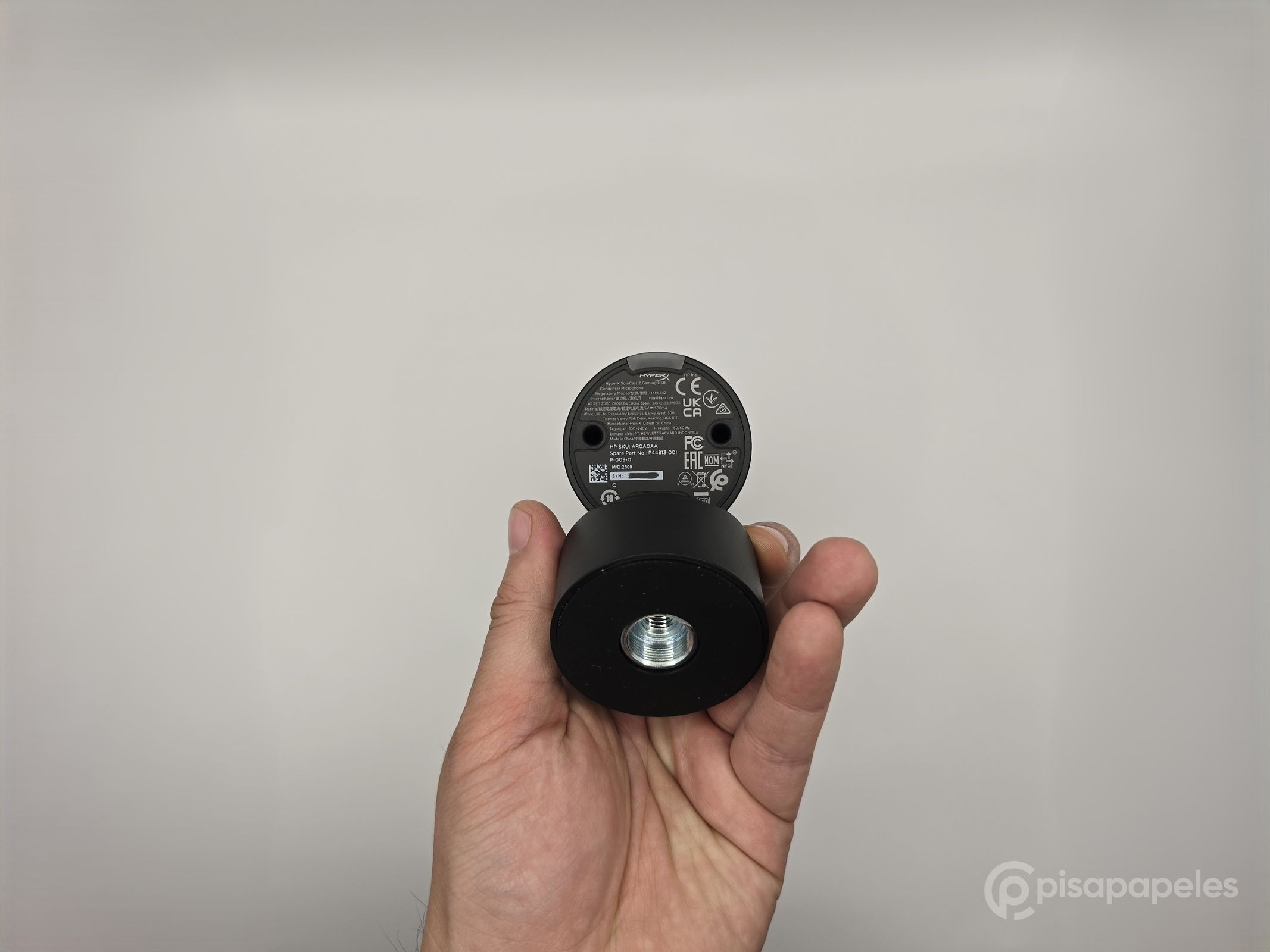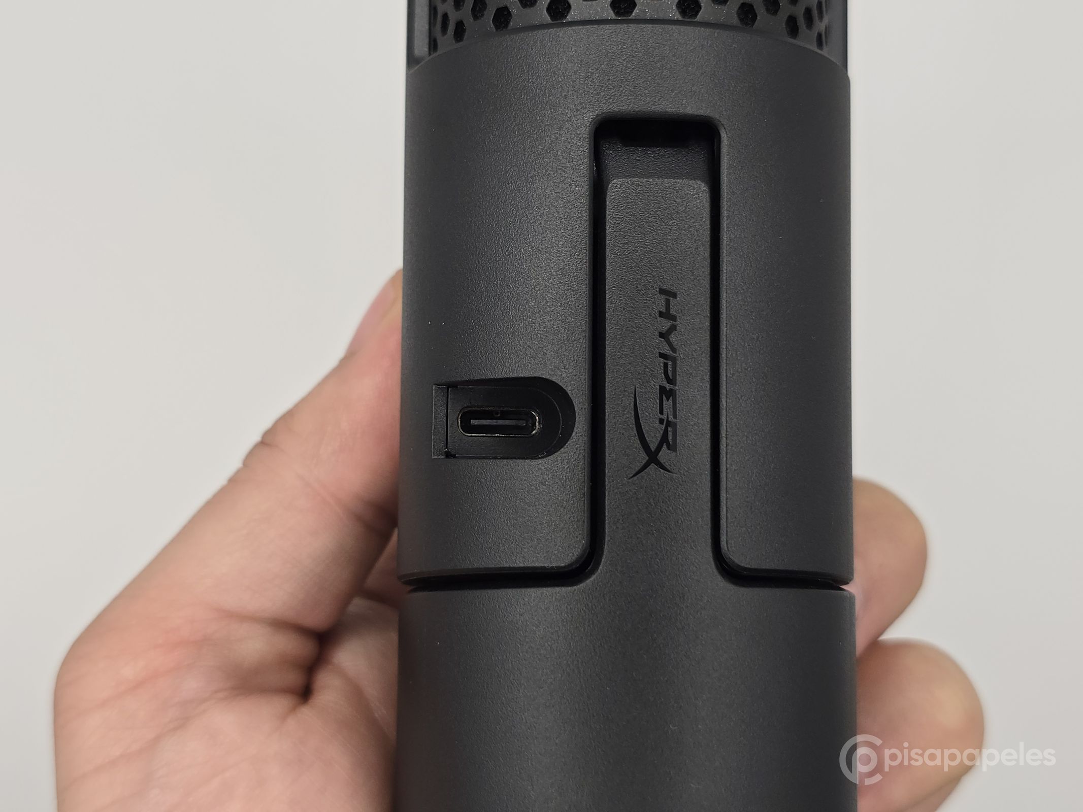 En la parte trasera vemos el respectivo logo de HyperX y el puerto USB de tipo C para su conexión. Mientras que, en la parte superior, podemos apreciar el botón táctil que permite silenciar el dispositivo según la necesidad del usuario. Por el lado frontal podemos ver un pequeño LED de color rojo, el cual indica cuando el micrófono está en funcionamiento, y si está silenciado, el LED se apaga. Es un poco extraña la lógica, ya que cuando se quiere mostrar un micrófono silenciado, generalmente se activa la luz roja, pero este no es le caso.