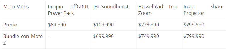 Por ahora el Moto Z está solamente disponible en Movistar a un precio de CLP $649.990 e incluye un Style Shell y el Incipio offGRID. Sabemos que también eventualmente llegará a Falabella y a la tienda online oficial de Motorola, aunque sin fecha confirmada. Además, puedes acceder a distintos bundles para obtener los Moto Mods, tal como se puede ver en la tabla adjunta.