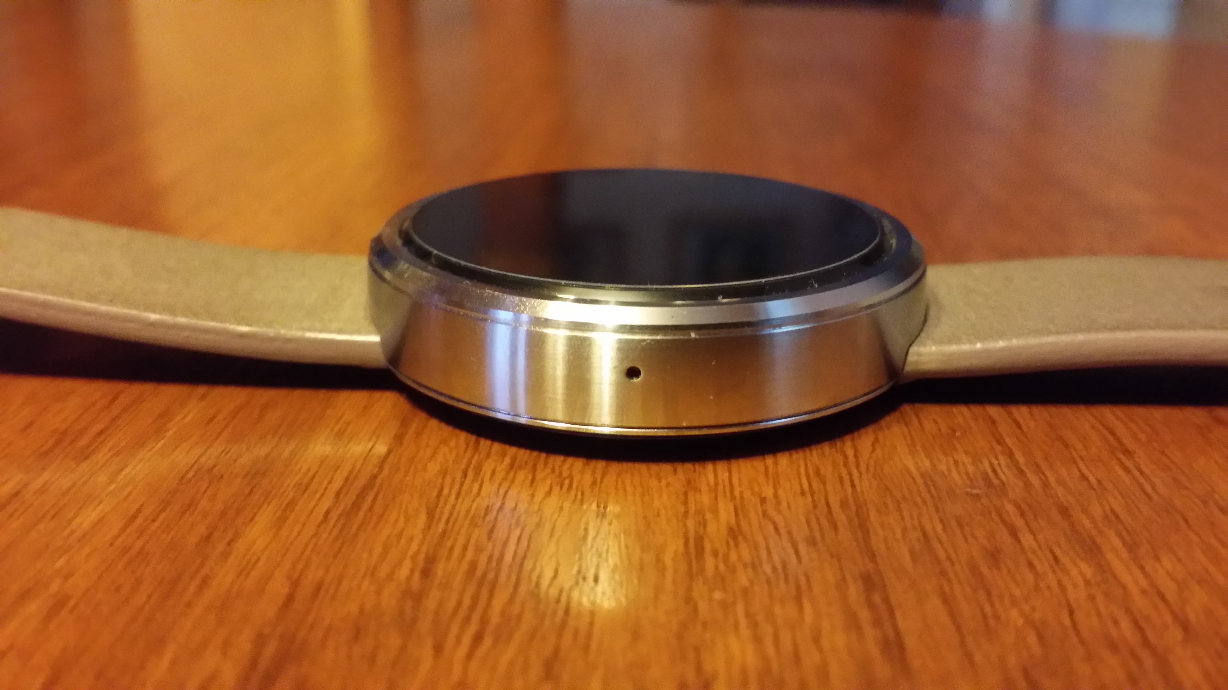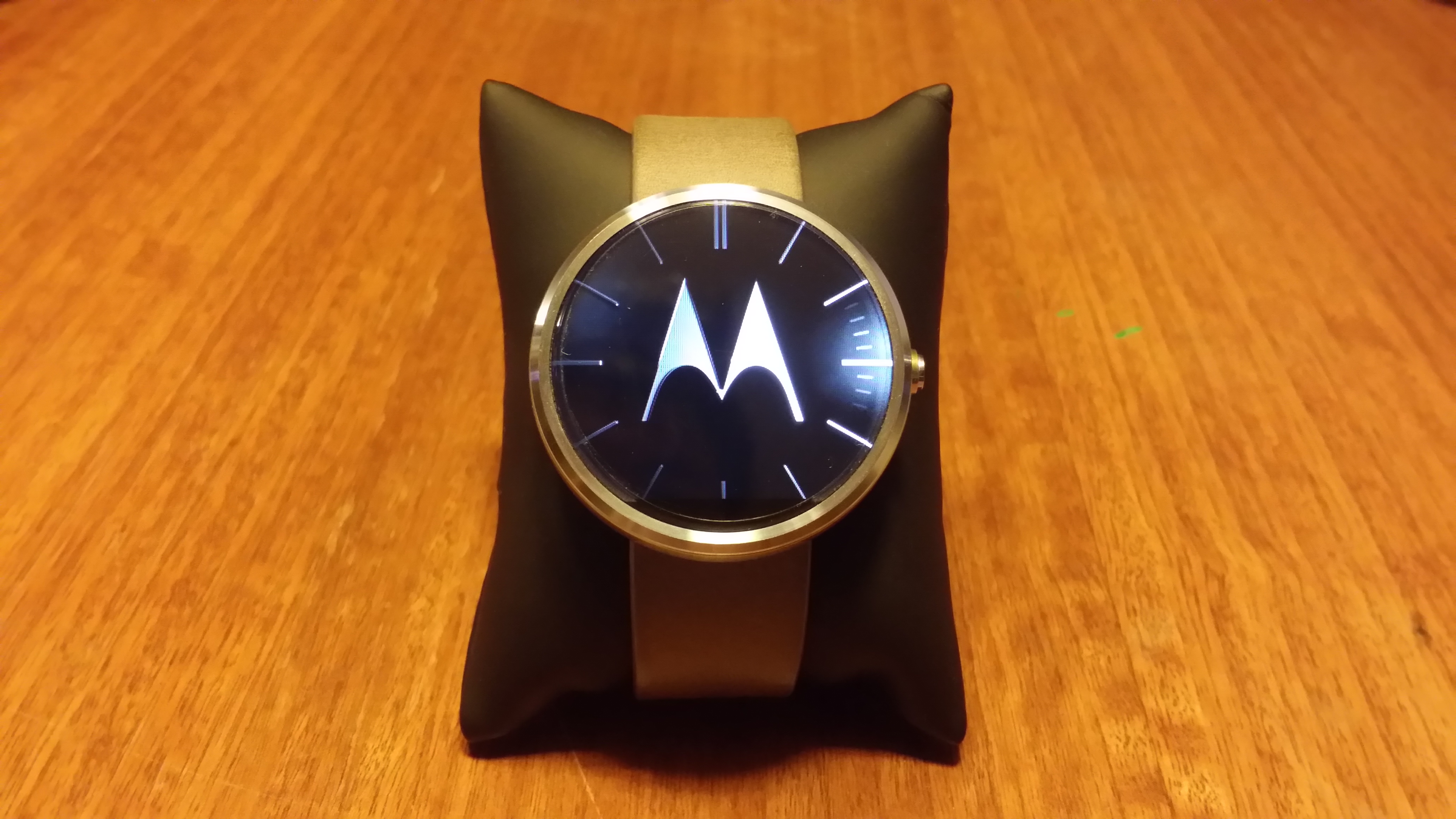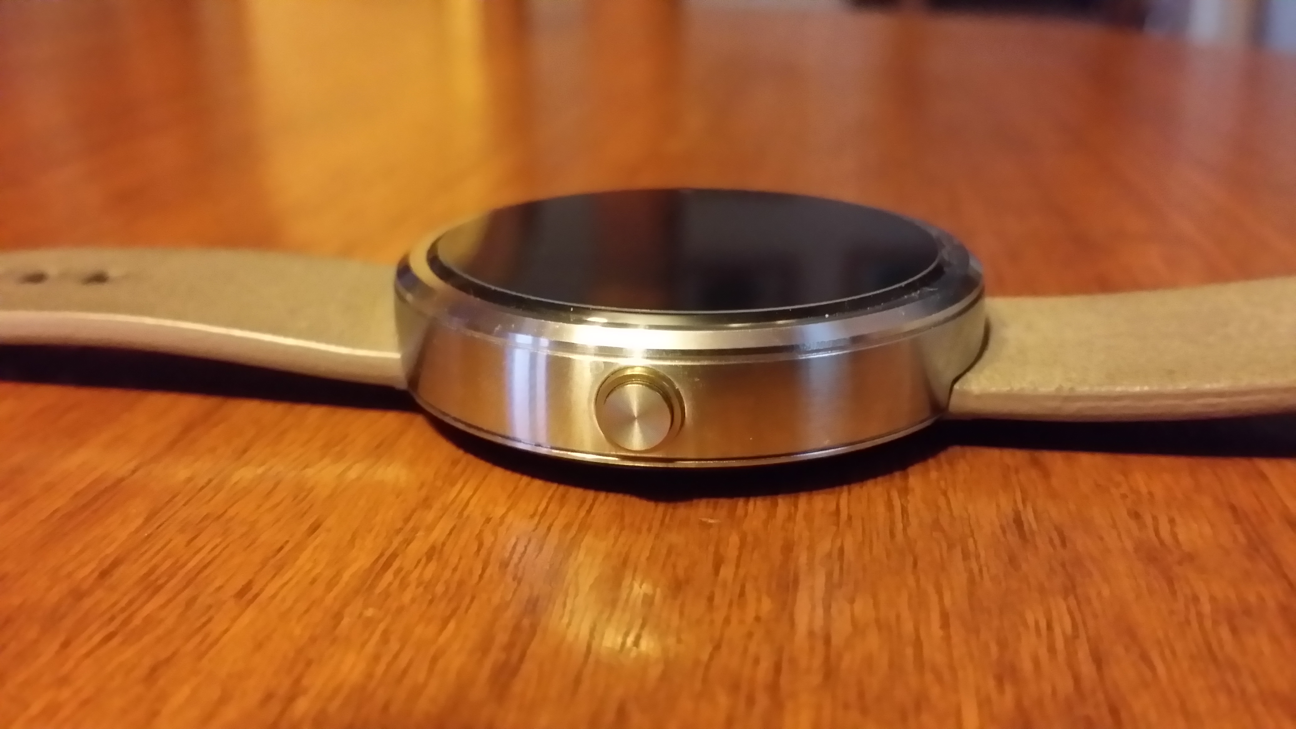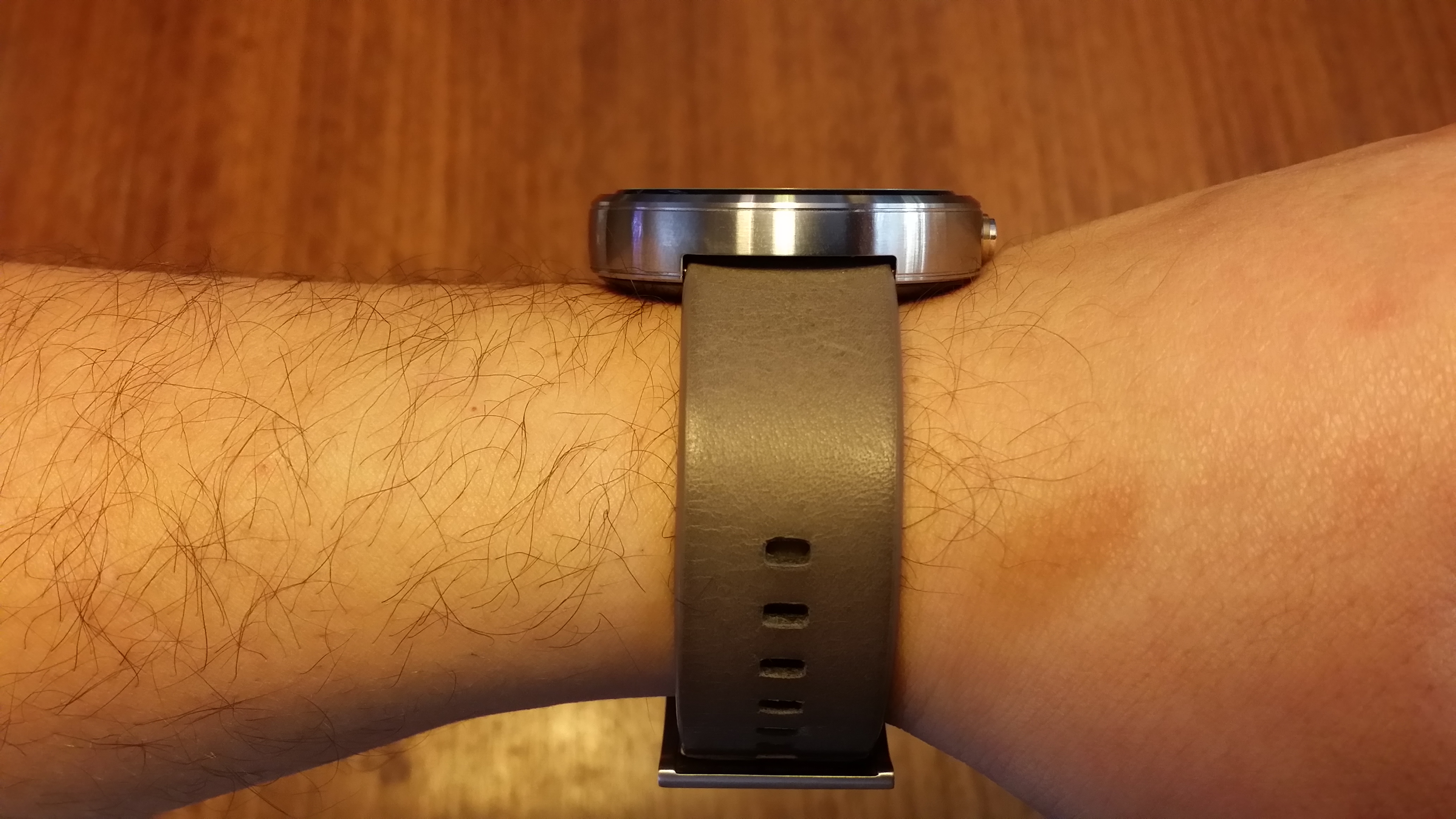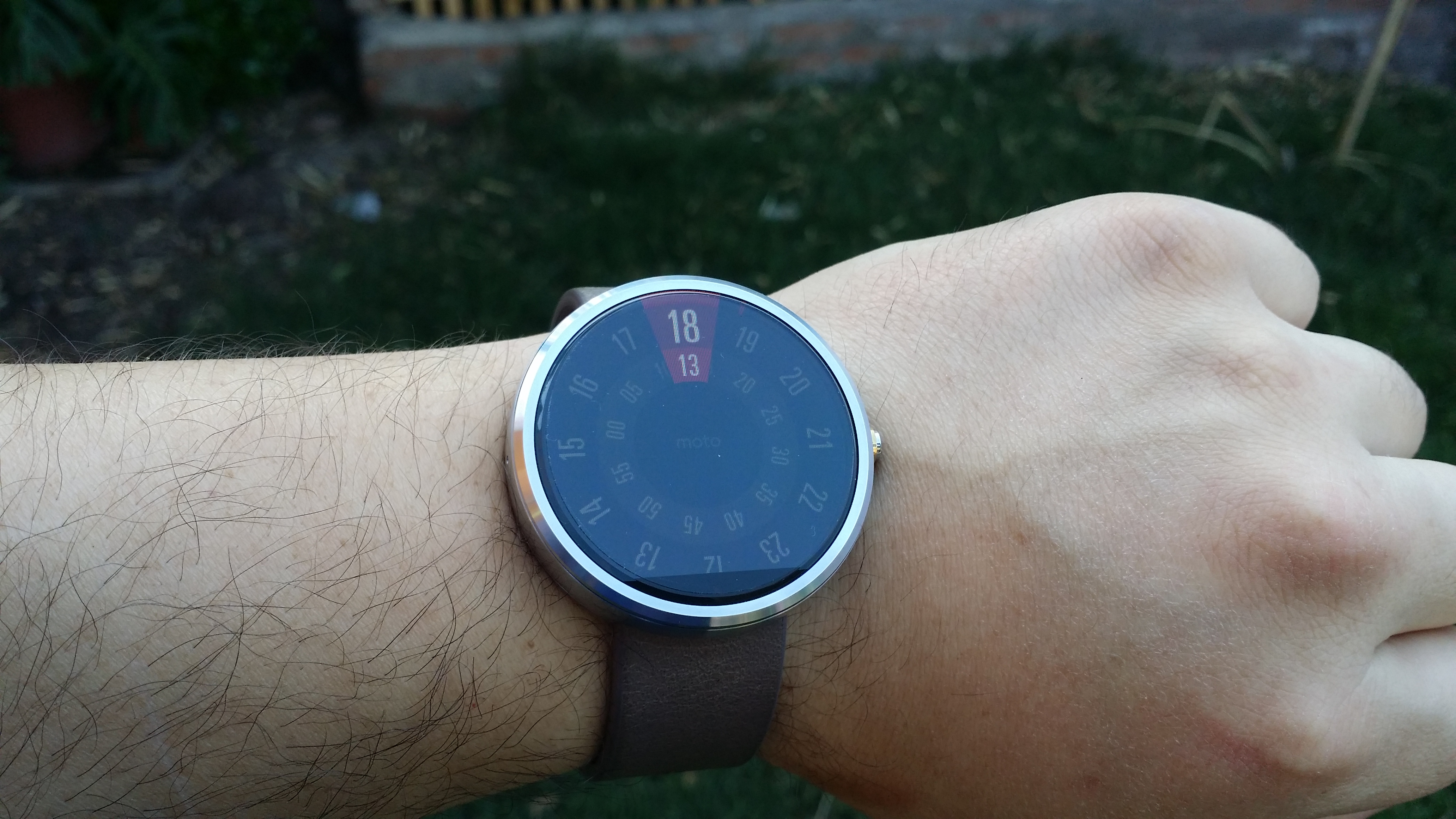 Otro apartado que nos interesa de la pantalla es su visualización a la luz solar y el Moto 360 resulta bien parado. Ésto se debe a que en la parte inferior de la pantalla se encuentra un sensor de luz ambiental, que si bien quita un poco de estética al reloj, se agradece la funcionalidad ya que sería un completo caos ajustar manualmente el brillo de la pantalla. Nota: las rallas y suciedad son son de una mica que adquirí para proteger la pantalla del reloj.