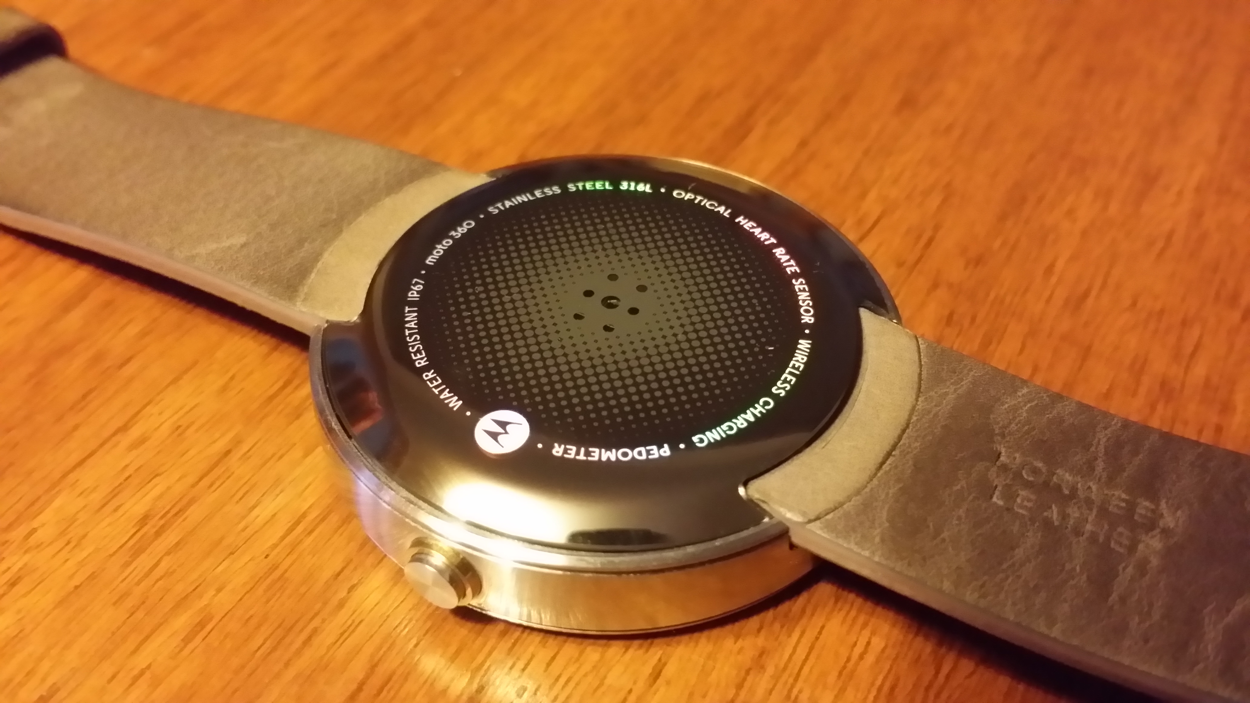 En la parte trasera podemos apreciar el sensor de frecuencia cardíaca, el logo respectivo de Motorola y leyendas sobre características del reloj como podómetro, la norma IP67 para la resistencia al agua, el acero Stainless con norma 316L para la resistencia a la corrosión y el grabado en la correa de cuero cortesía del fabricante Horween.