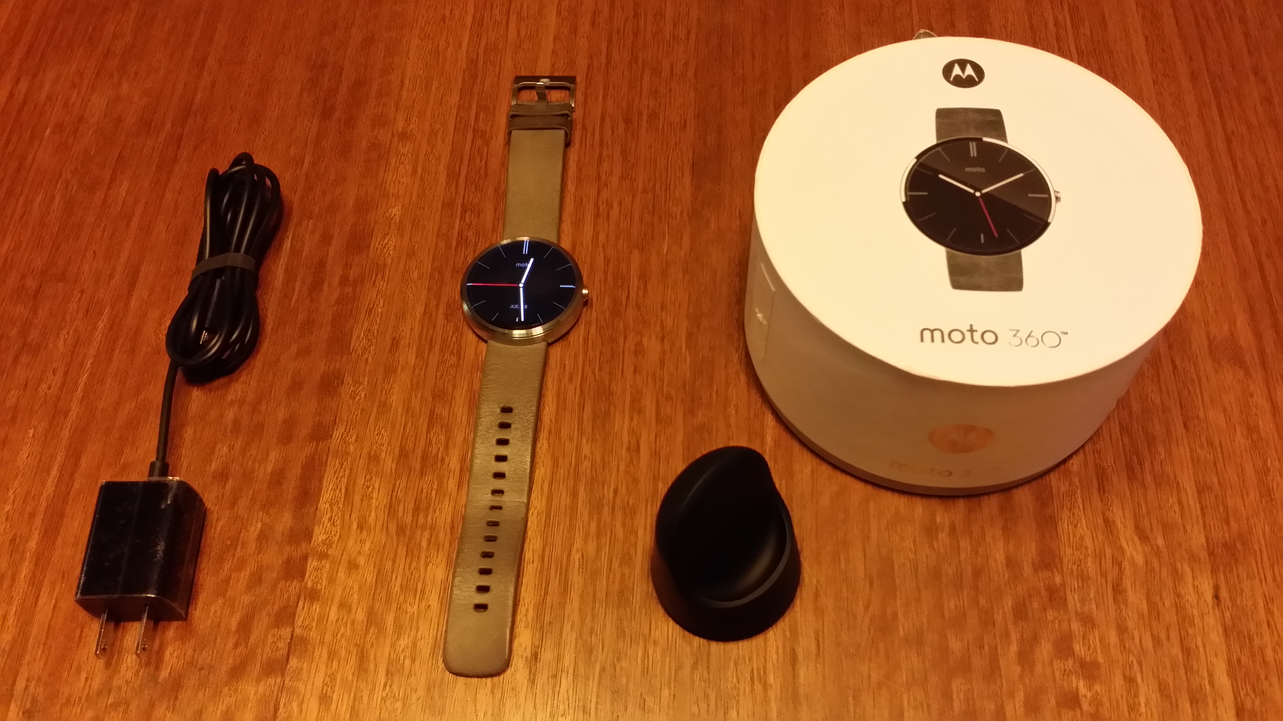 Haciendo honor al reloj, la caja del Moto 360 es de forma circular con un diseño bastante sencillo. En su interior podremos encontrar un cargador con salida microUSB de 550 mAh, una base de carga inalámbrica con entrada microUSB, manuales, guía rápida de usuario, y lógicamente, el reloj. No hay artículos extras y su contenido es el necesario para poner en funcionamiento el Smartwatch forma normal.