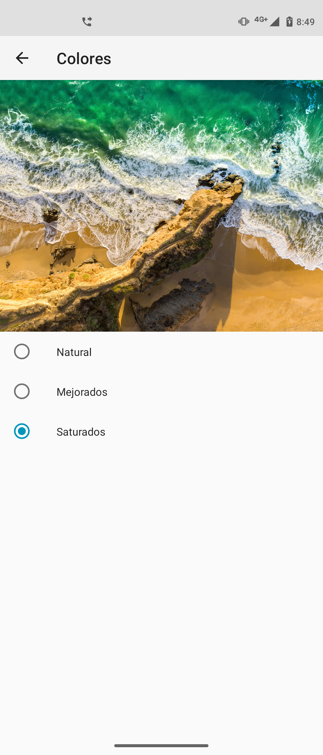En cuando a los ajustes disponibles, tenemos un apartado en el menú de configuración llamado “Colores”, en donde podemos elegir entre tres opciones predefinidas: “Natural”, “Mejorados”, y “Saturados”. No tenemos ninguna opción para corregir el balance de blancos o la temperatura de manera manual.