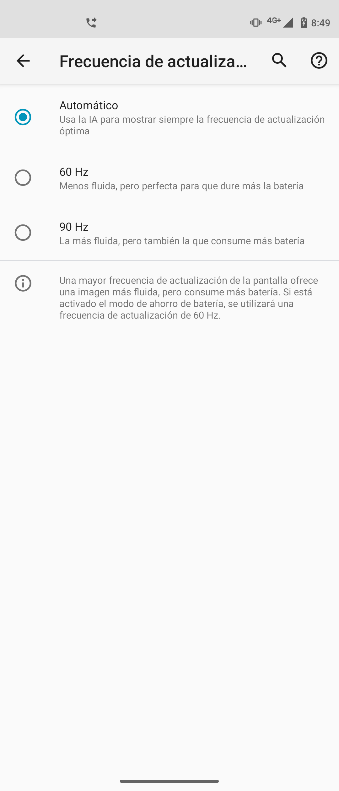 Volviendo al tema de los 90Hz de refresco, en el menú de ajustes podemos seleccionar si queremos que todo el contenido se muestre a 90Hz o que se muestre a 60Hz fijos. Sin embargo, también tenemos la opción “Automático” en donde utilizará la inteligencia artificial para ajustar la tasa de refresco a la frecuencia de actualización óptima.