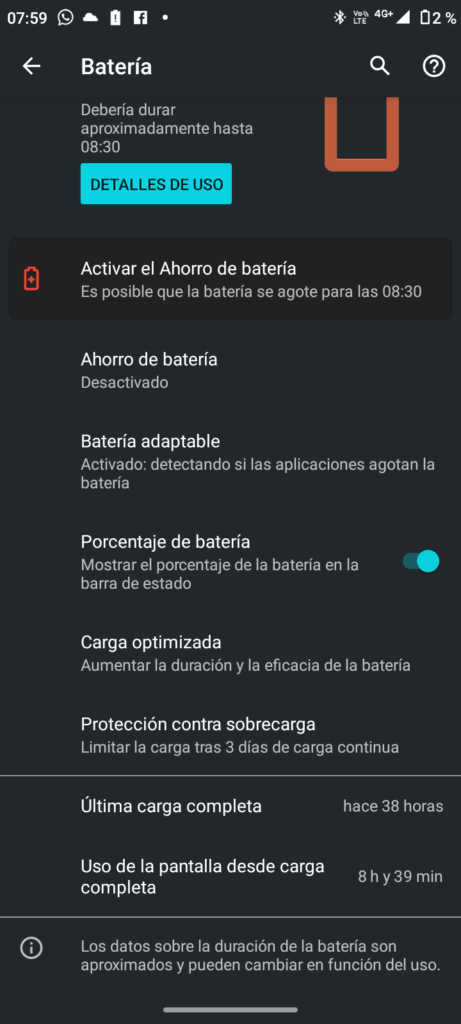 De vez en cuando desactivaba el Wi-Fi, pero en gran parte usé datos móviles, y la pantalla la tenía con su tasa de refresco en modo automático, al igual que su brillo. Con todo lo descrito anteriormente, el equipo me entregó una autonomía de 38 horas, y con un uso de pantalla de 8 horas y 39 minutos.