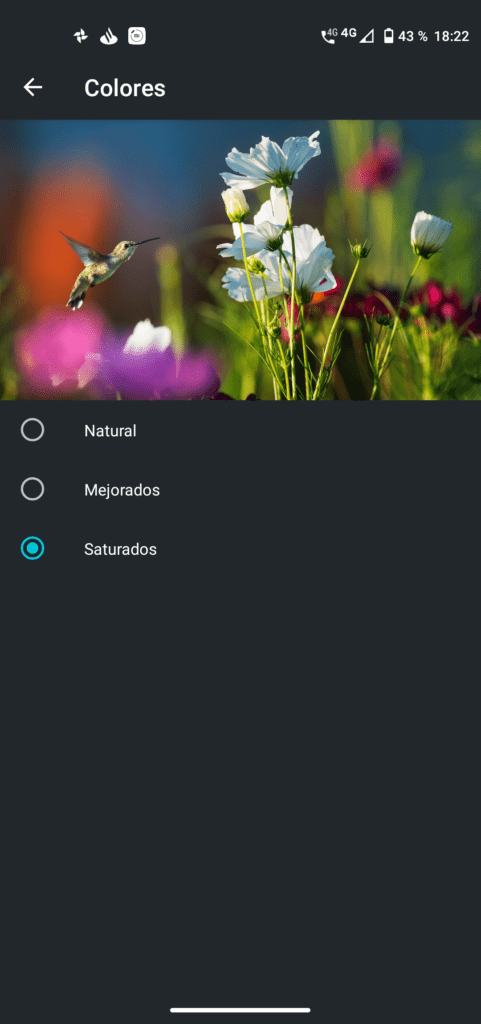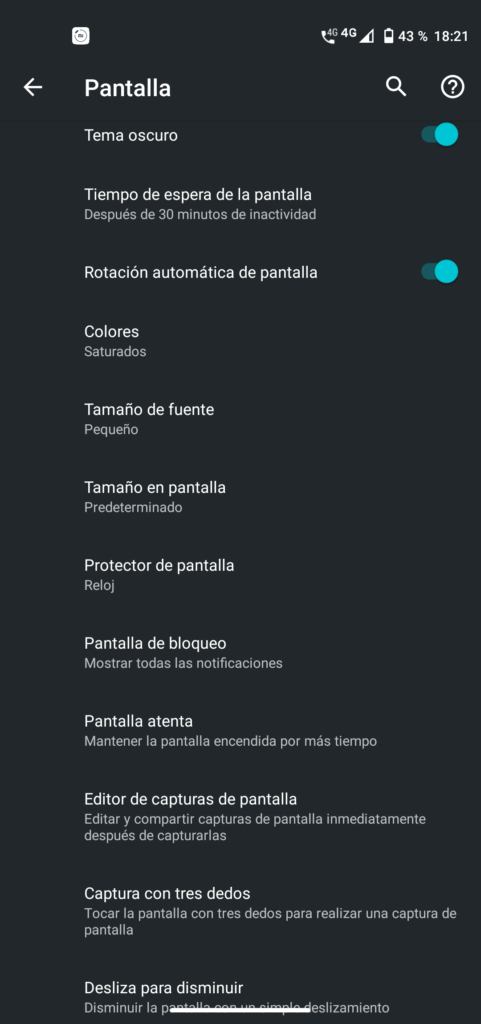 Entre los ajustes disponibles vamos a tener la posibilidad de ajustar el brillo, modificar el fondo de pantalla, modificar la pantalla interactiva, activar el modo oscuro, modificar la saturación de colores (Natural, Mejorados, o Saturados), modificar el tamaño de pantalla y fuente, entre otras opciones.
