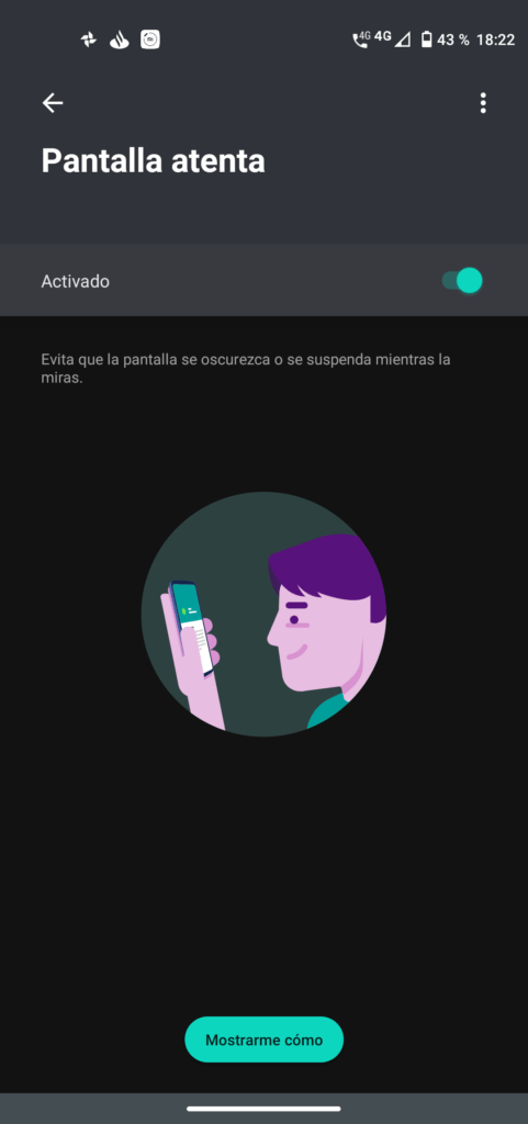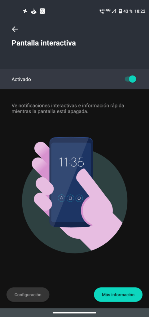 La pantalla interactiva nos permitirá visualizar notificaciones cuando la pantalla se encuentre apagada. De esta manera, cuando no estemos usando el móvil y nos llega una notificación, aparecerá el ícono de la app que ha enviado una notificación, además de mostrarte la hora actual y puedes elegir si quieres que se encienda la pantalla cuando tomes el equipo o cuando llegue una notificación. Una función bastante útil.