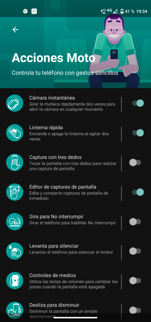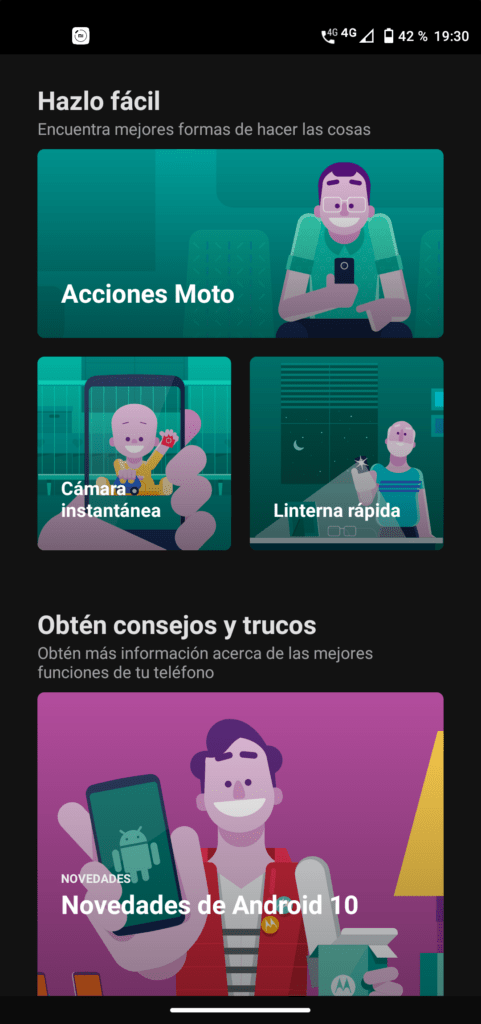 Como ha sucedido en la gran mayoría de smartphones de Motorola, nos encontraremos con una aplicación llamada Moto con la cual tendremos acceso a las “Acciones Moto” donde encontraremos variadas funciones del equipo que podremos realizarla con variados gestos.