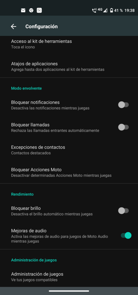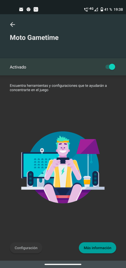 Luego tenemos la “Pantalla Moto” que incluye las funciones Pantalla Interactiva y Pantalla Atente de las que te hablé más arriba. Finalmente tenemos algo que yo personalmente no conocía llamado Moto Gametime, una función que nos ofrecerá diversas herramientas que nos resultarán útil cuando estemos jugando en el equipo.