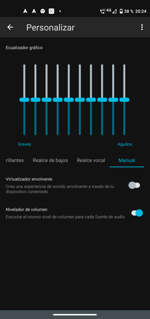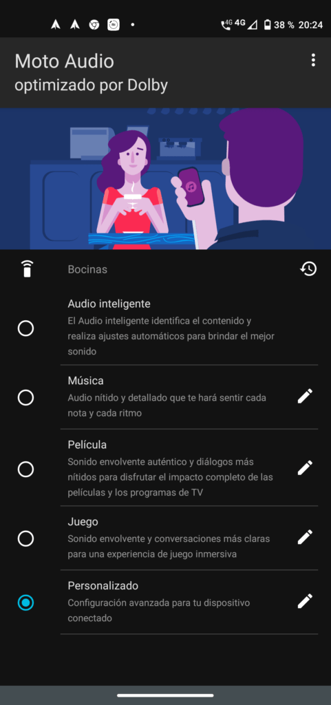El equipo cuenta con Moto Audio el cual es potenciado por Dolby. Esto nos ofrece los perfiles “Audio inteligente”, “Música”, “Película”, “Juego”, y Personalizado. En este último se habilita un ecualizador de 10 bandas, y los efectos de audio “Virtualizador envolvente” y “Nivelador de volumen”.