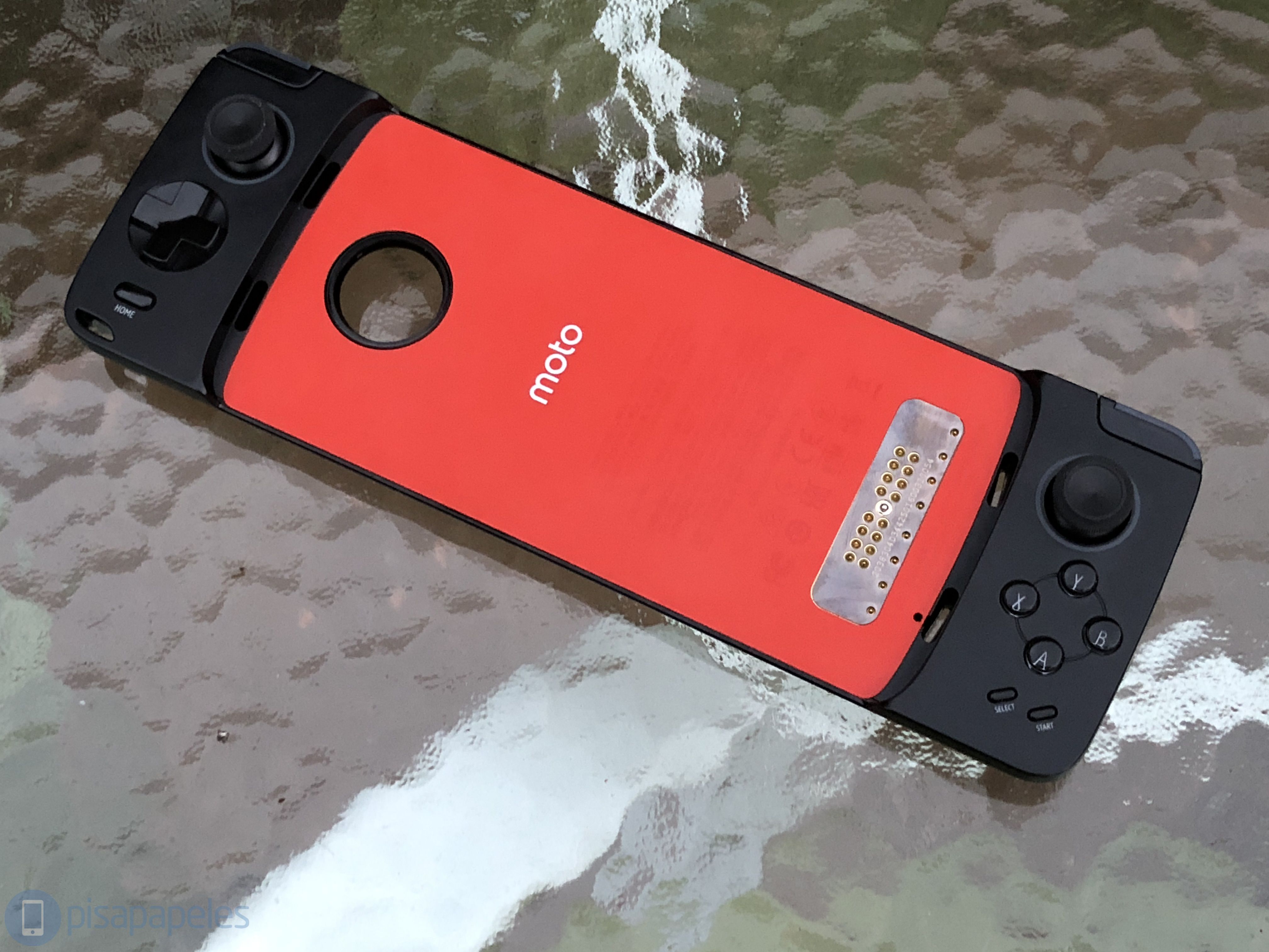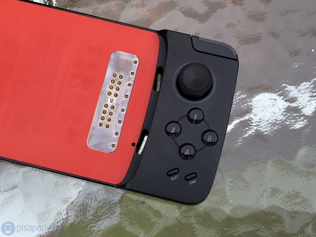 Por la parte frontal del Moto Gamepad encontraremos los controles, en donde veremos por el lado izquierdo un control análogo, un control digital y la tecla HOME, mientras que por el lado derecho veremos otro control análogo, cuatro teclas circulares Y – B – A – X, y las ya clásicas teclas SELECT y START. En la parte central del Moto Mod podremos ver un agujero donde calzará perfectamente la cámara de nuestro miembro de la familia Moto Z y los 24 pines que harán contacto con los pines del smartphone.