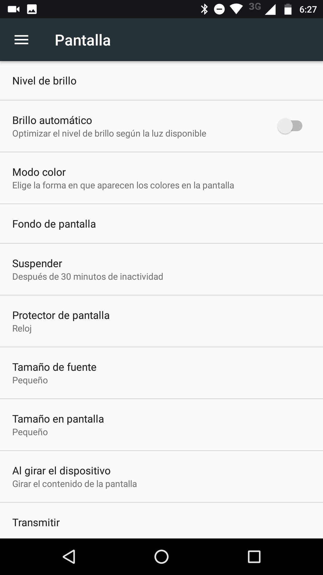 Entre las opciones disponibles que encontraremos para ajustar la pantalla, tendremos la posibilidad de manejar el brillo, activar el modo automático del brillo, elegir el modo de color entre las opciones estándar y brillante, modificar el tamaño de la fuente, así como también el tamaño de la pantalla y finalmente tenemos la opción para transmitir la pantalla a un dispositivo compatible con Google Cast.