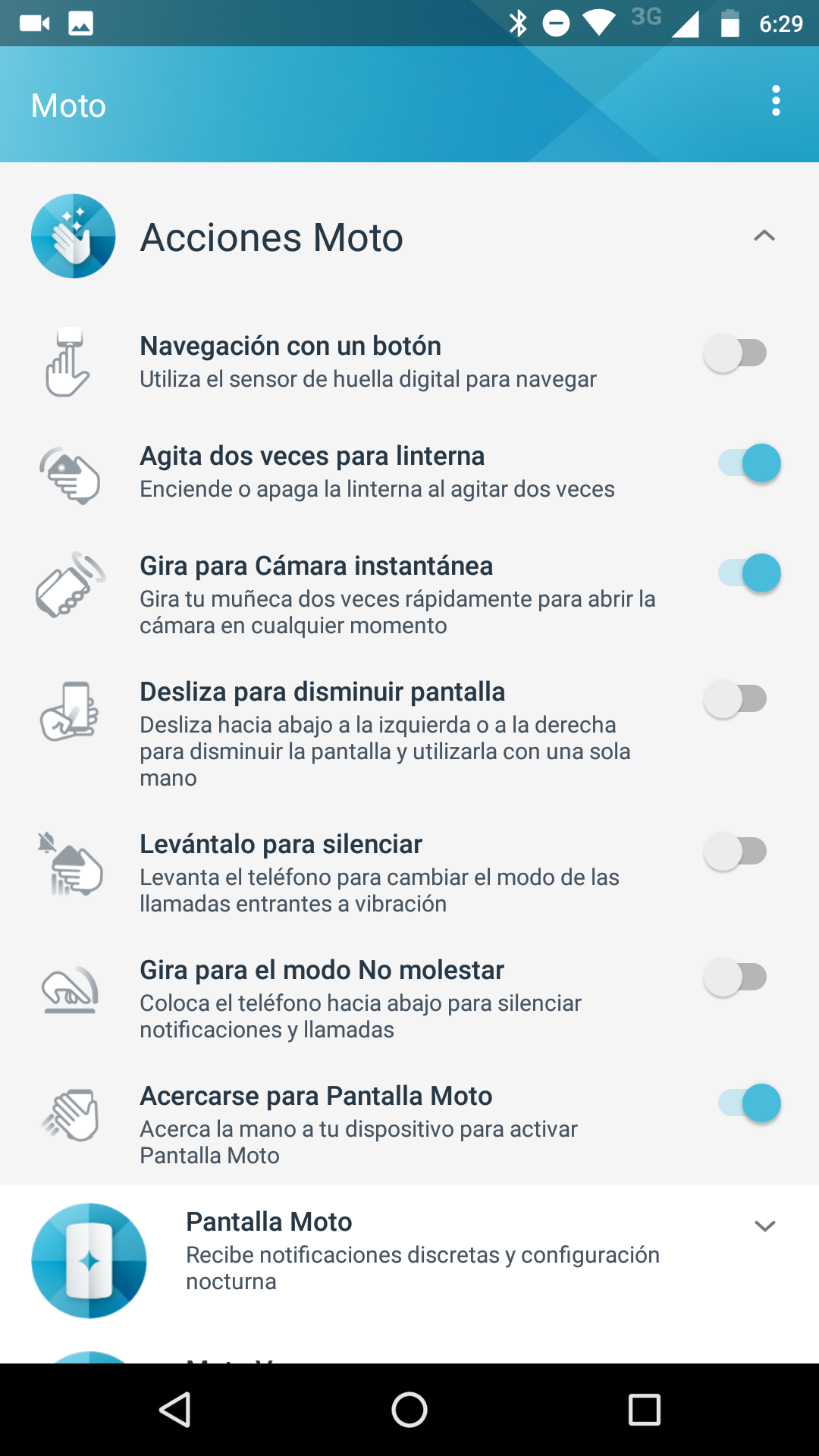 Dentro de la aplicación Moto encontraremos las Acciones Moto, un apartado donde podrás configurar un gran cantidad de gestos, como el clásico de agitar el equipo dos veces para encender la linterna o girar el móvil para activar la cámara, entre otros gestos que incluso involucran al lector de huellas.