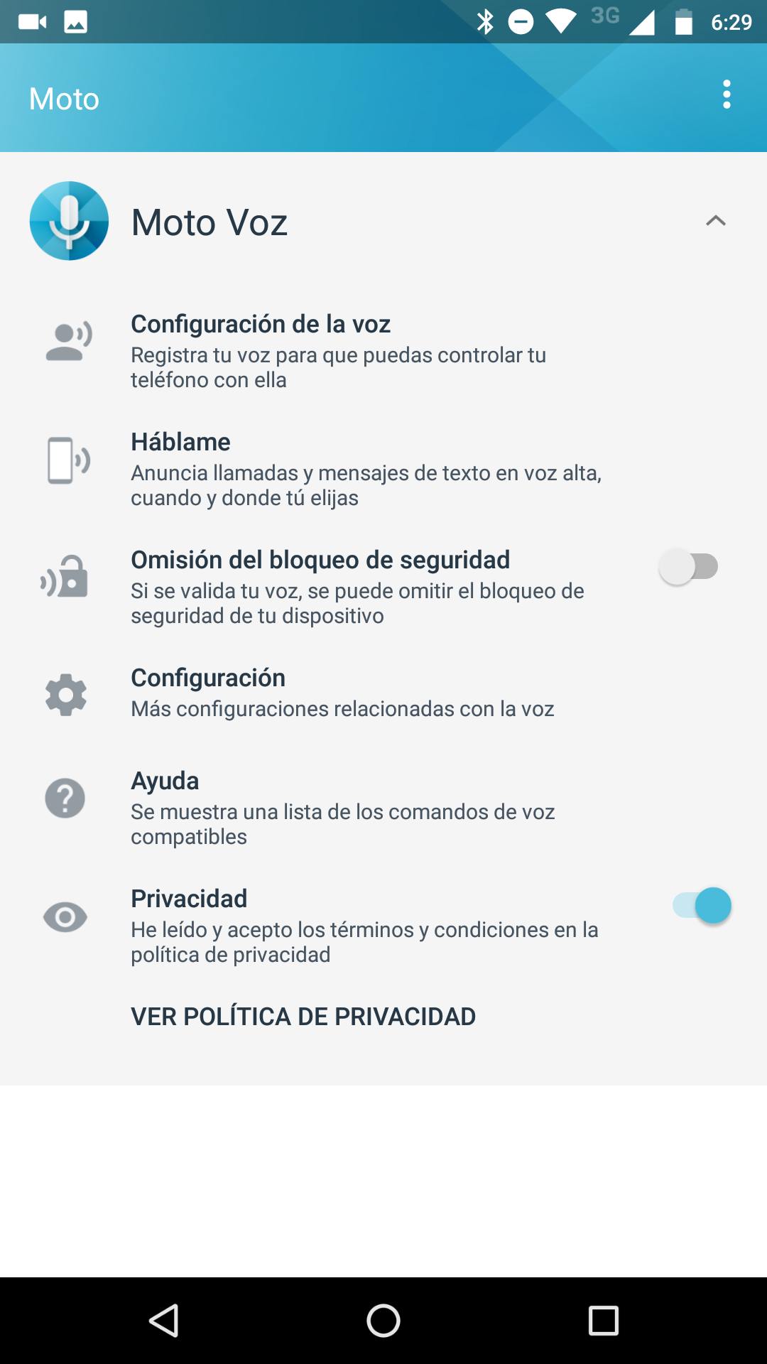 Siguiendo dentro de la app Moto, encontraremos los ajustes de Moto Voz donde podremos desbloquear el equipo con solo utilizar nuestra voz o permitir que el equipo nos vayan leyendo mensajes y anunciando llamadas cuando estemos conduciendo, entre otras funciones.