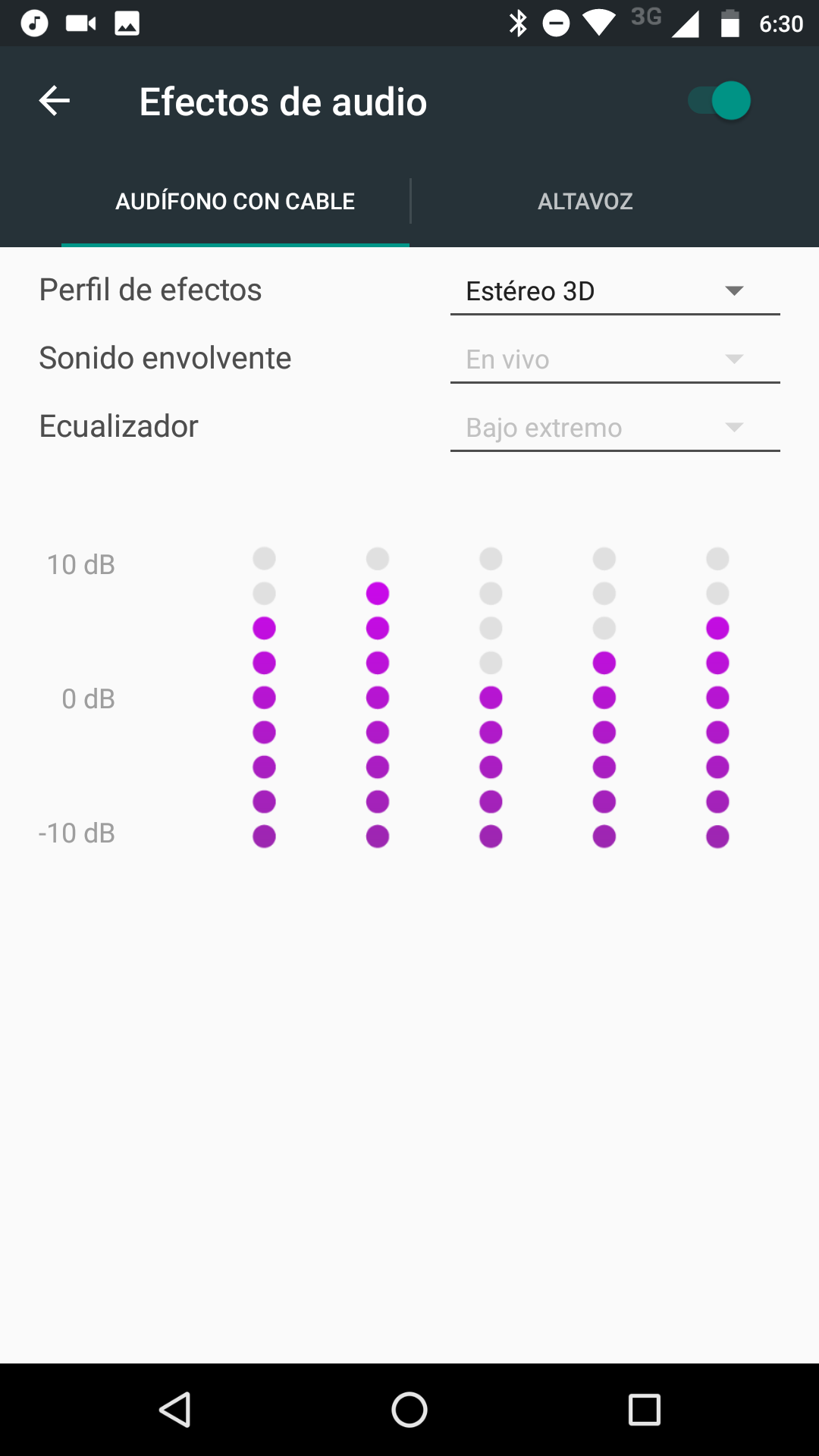 Si bien Motorola no incluye un ecualizador y/o efectos de audio para ser usado en todo el sistema, Google Music incluye el suyo donde vas a encontrar un ecualizador de 5 bandas, tanto para el altavoz como para el audio con audífonos. También tendrás efectos de audio 3D, sonido envolvente, entre otros efectos.
