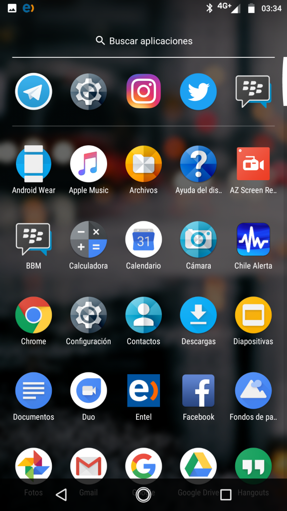Aplicaciones usadas (aparte de los juegos): Twitter, Facebook, Messenger, Google Chrome, Google Now, Google Asistant, Apple Music, Gmail, YouTube, Net Monitor Lite, Speedtest, Chile Alerta, Instagram y Telegram.