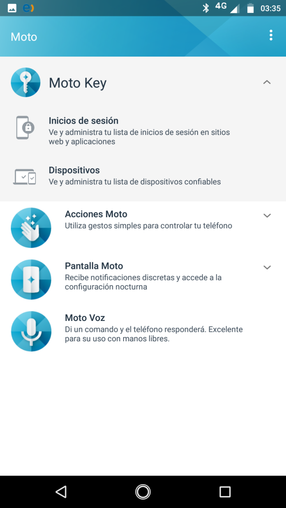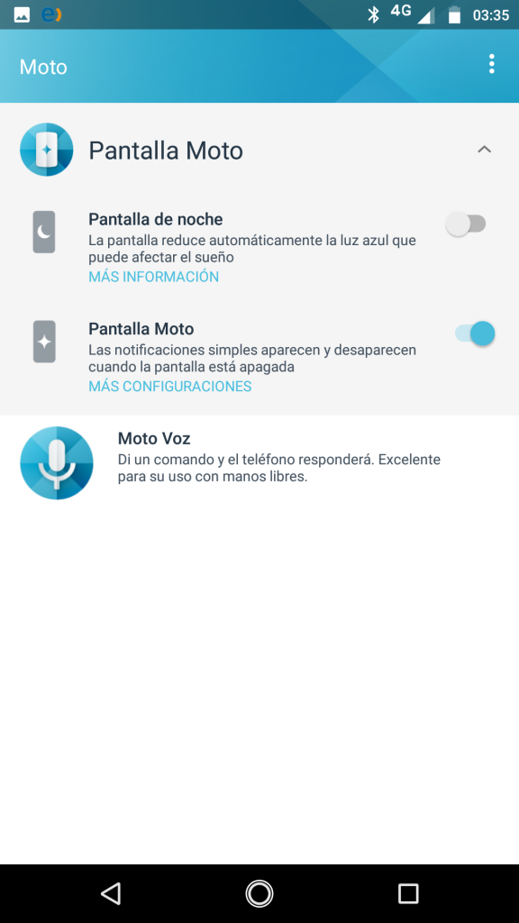 Cuando tengamos configurado nuestro equipo, nos encontraremos con la aplicación Moto. En ella veremos cuatro funciones especiales, algunas conocidas y otras que para mi resultaron ser completamente nuevas: