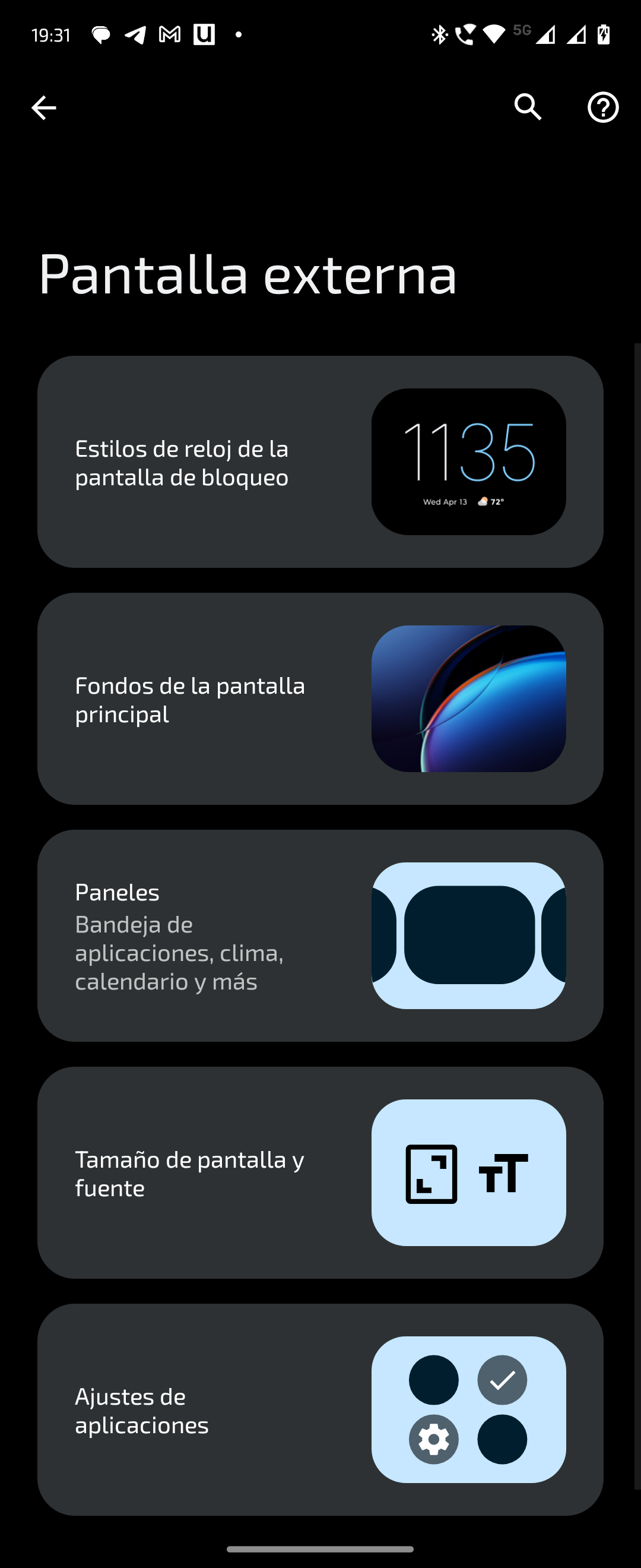 Para la pantalla externa vamos a poder modificar el estilo del reloj de la pantalla de bloqueo, el fondo de pantalla, los paneles disponibles, tamaño y fuente de pantalla y modificar ajustes de aplicaciones.
