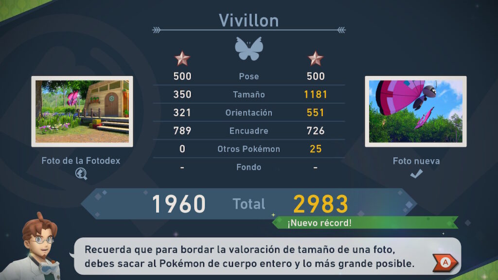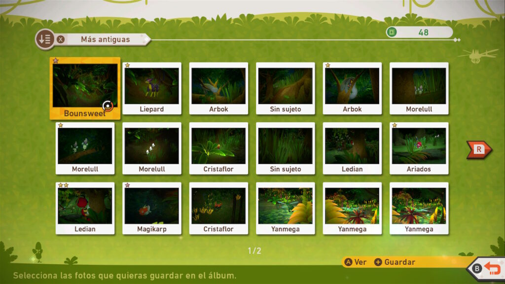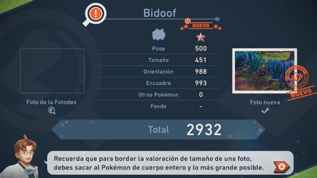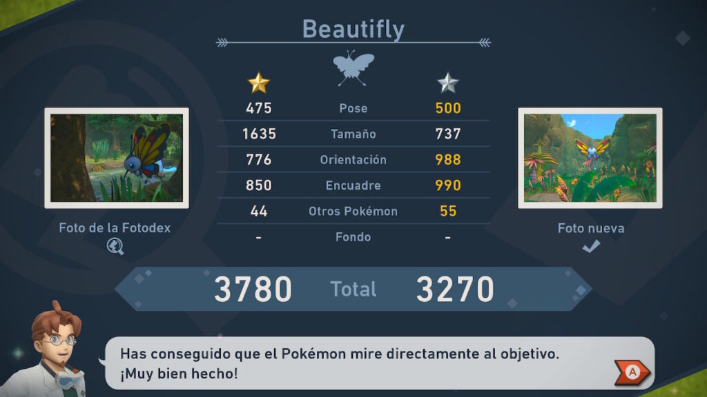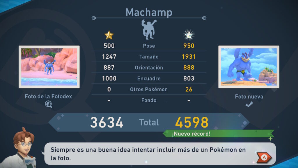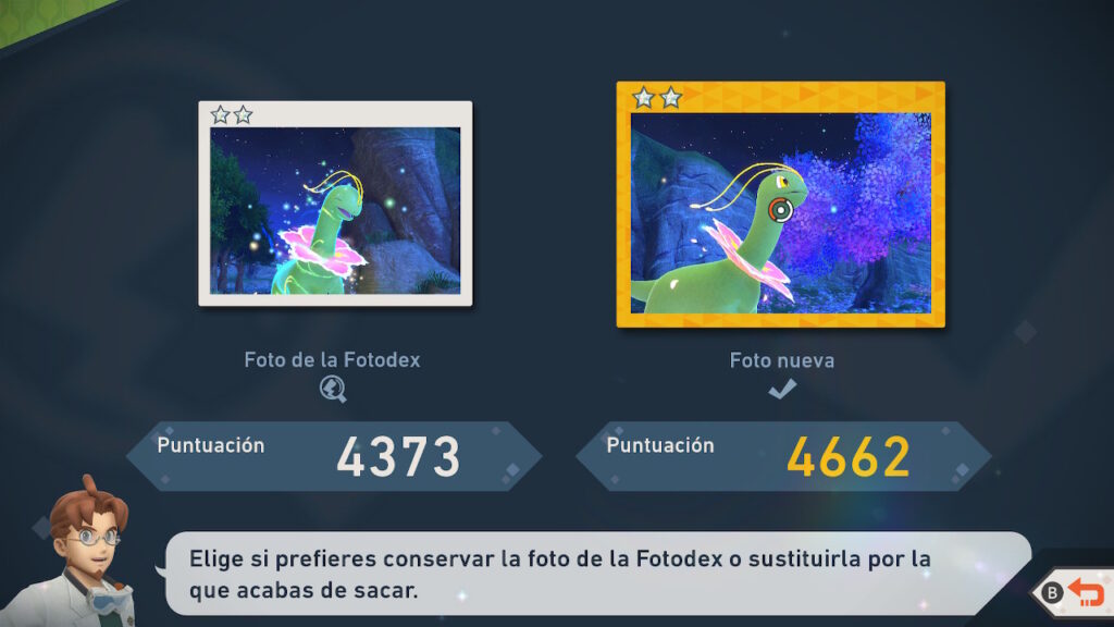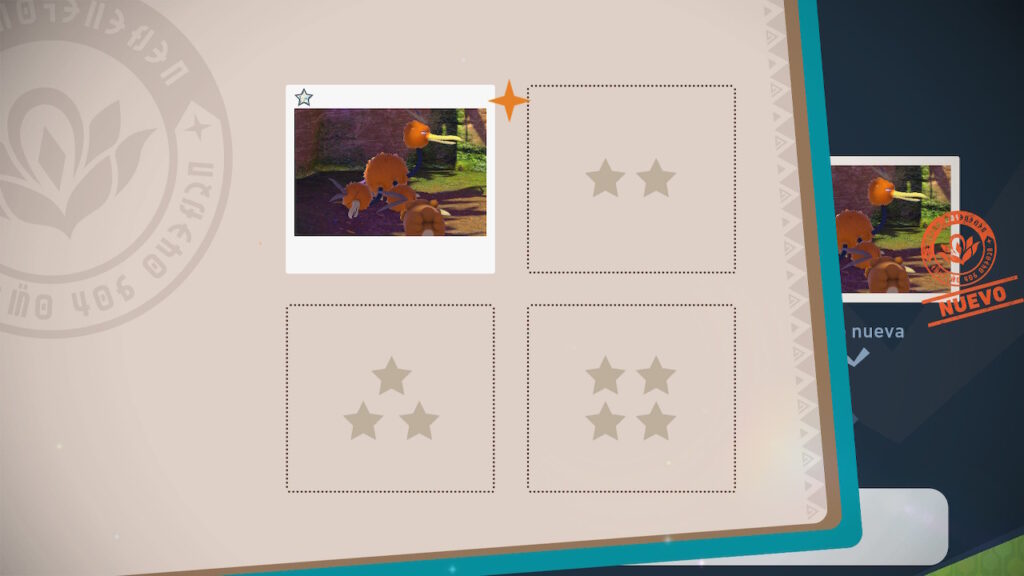 Pero esto no termina aquí, pues para cada uno de los Pokémon que tenemos, se nos entrega una página de nuestro Fotodex que tiene las categorías de 1 a 4 estrellas. Es decir, podemos tener hasta 4 fotos de cada Pokémon en cada página de la Fotodex, y no es para nada simple determinar que hace que una foto sea catalogada de 1 estrella mientras otra es catalogada como de 4 estrellas. Esto hace que al menos tengamos que sacar 4 fotos de cada uno de los más de 200 Pokémon para poder completar el juego al 100%.