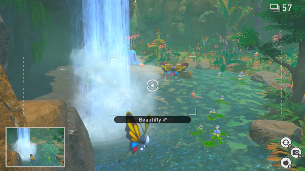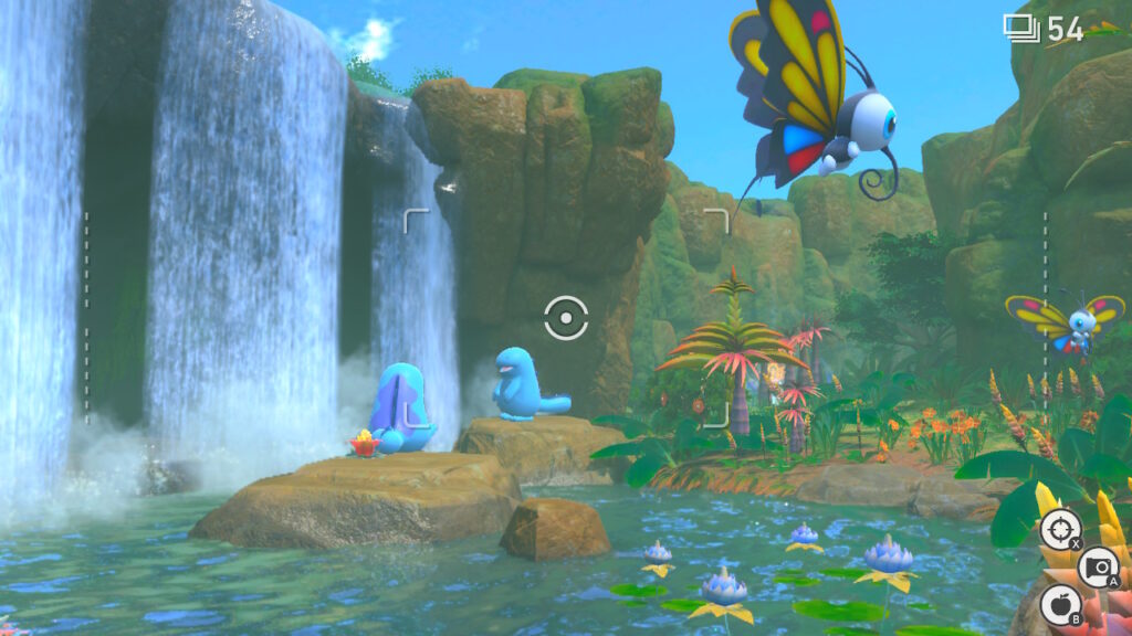 Entonces, de partida nos encontramos con el primer nivel, y es ahí donde la nostalgia nuevamente nos da un golpe, pues recordamos que hace 21 años habían cosas que no nos eran posibles, pero esta vez si lo son. Por ejemplo, podemos ver lo que está pasando bajo el aguay así sacarle fotos a los Magikarp o ver a los Lapras nadar, o incluso sacar fotos desde muy –muy– cerca, pero esta vez Bandai Namco ha hecho un trabajo estupendo con los modelos de Pokémon, así que no es molesto verlos desde tan poca distancia.