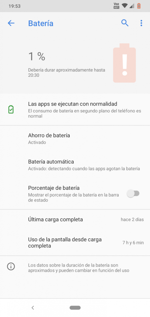 Con el uso descrito anteriormente, el Nokia 4.2 me entregó una duración total de 2 días y 3 horas aproximadamente, mientras que en pantalla activa logró entregarme 7 horas. Cabe agregar que el equipo se encuentra programado de fábrica para que al alcanzar el 15% de energía se active automáticamente el modo de ahorro de batería.