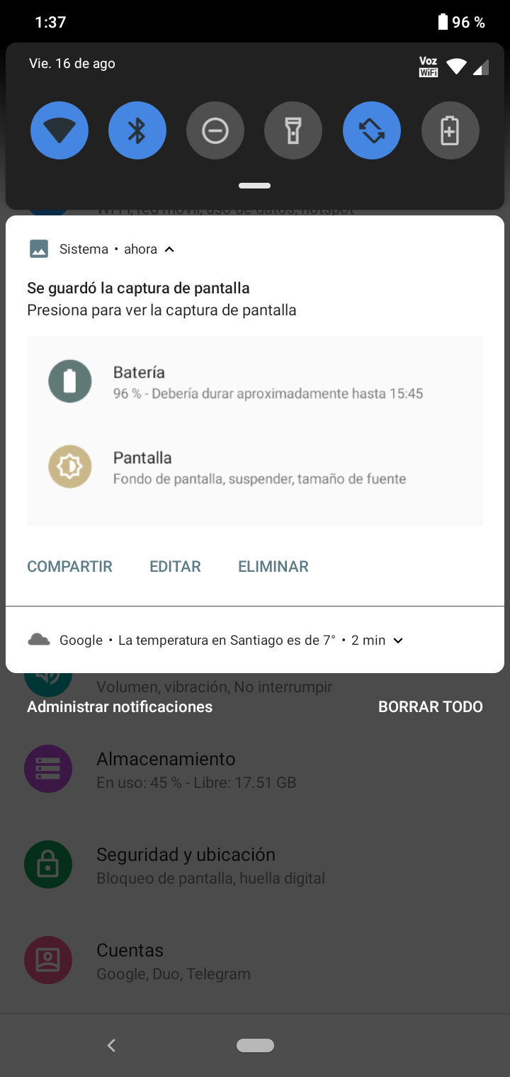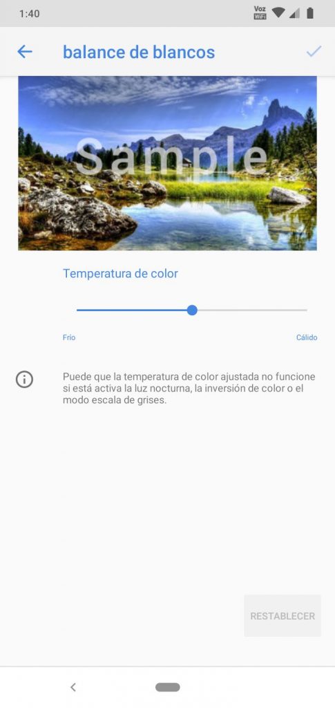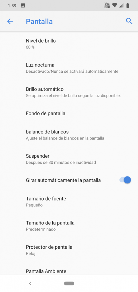 En cuanto a ajustes disponibles encontraremos la opción para activar el brillo automático, modificar el tamaño de visualización, activar la luz nocturna, así como también activar la pantalla ambiente que aparece cuando recibimos notificaciones nuevas o activar el tema claro, oscuro o que se cambie de manera automática.