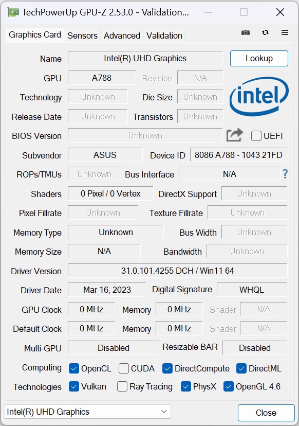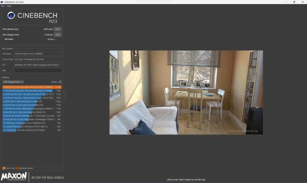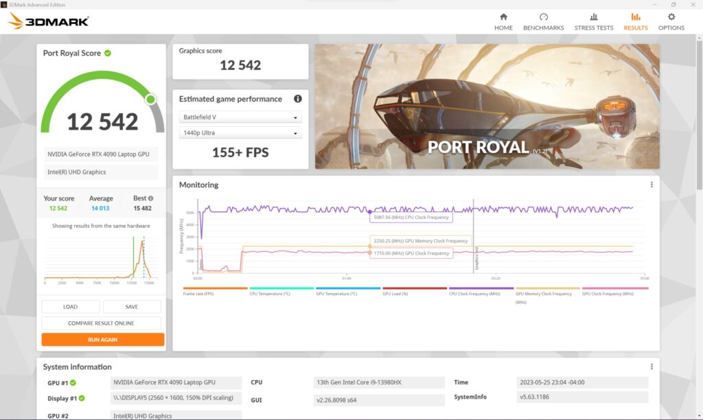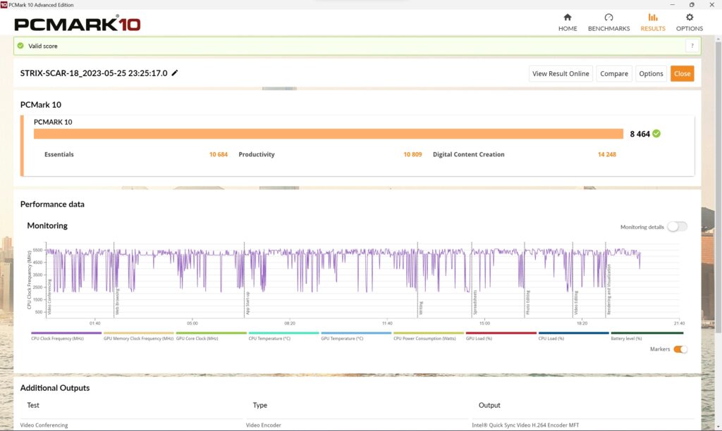 Si tenemos un portátil gamer, uno de los aspectos importantes que debemos conocer es su potencia. Y en esta sección sabremos cómo se comporta la nueva bestia de ASUS. Acá el equipo posee un procesador Intel Core i9 de 13ª generación. El modelo específico es el i9-13980HX con 24 núcleos, 36 MB de caché L3 y una frecuencia máxima de 5.6 GHz. Recordemos que ahora existe una nueva arquitectura de núcleos, de los cuales 8 son de alto rendimiento y 16 son de eficiencia energética. Su TDP base es de 55W, pero gracias a los núcleos de eficiencia puede disminuir el consumo hasta 45W, y por el contrario, cuando sacamos toda su capacidad el TDP puede subir hasta 157 W.