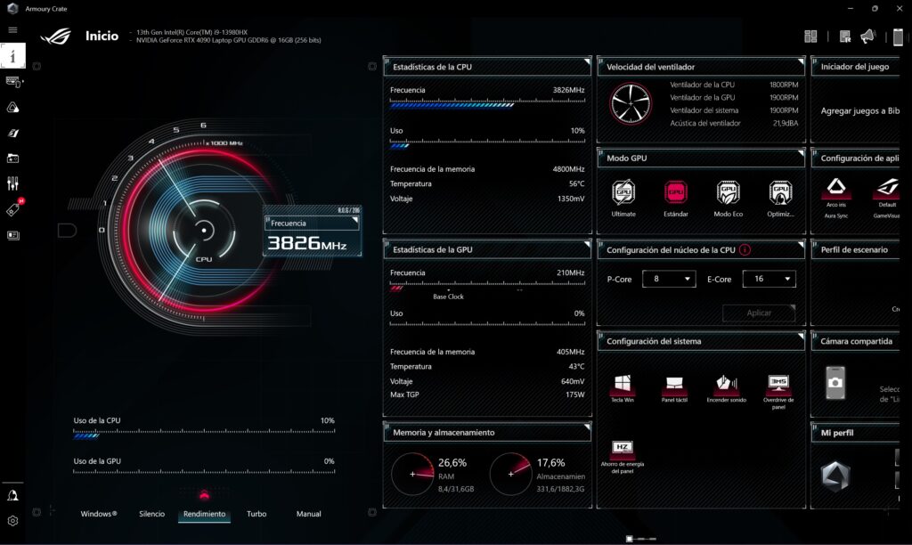 Por otra parte, una de las aplicaciones importantes de los equipos gamer de ASUS es Armoury Crate. Esta herramienta permite revisar datos y controlar funciones esenciales del equipo. Por ejemplo, podremos cambiar los perfiles de potencia, revisar los ajustes de los ventiladores, revisar información relevante como la frecuencia de la CPU o GPU, controlar las luces RGB del teclado o accesorios compatibles, incluso nos permite personalizar el botón ROG Eye situado sobre el teclado.