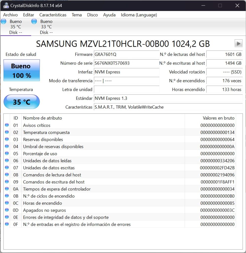 Respecto al almacenamiento, el portátil cuenta con dos módulos SSD marca Samsung en formato M.2 de 1 TB cada uno, dando un total de 2 TB. A su vez, el almacenamiento posee bus NVMe con la versión PCIe 4.0.