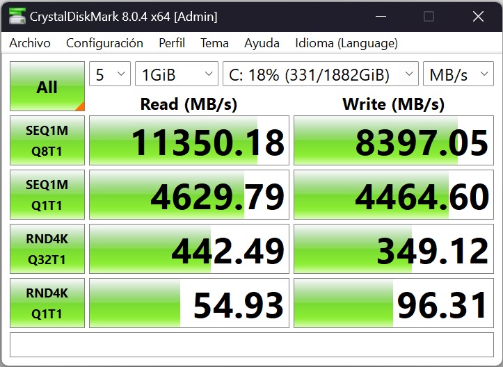 Al momento de revisar su rendimiento, ambos presentaron un comportamiento similar con velocidades aproximadas en lectura y escritura de 11.350 MB/s y 8.397 MB/s, respectivamente. Con este rendimiento transferir archivos o abrir aplicaciones será pan comido gracias a su enorme rapidez.