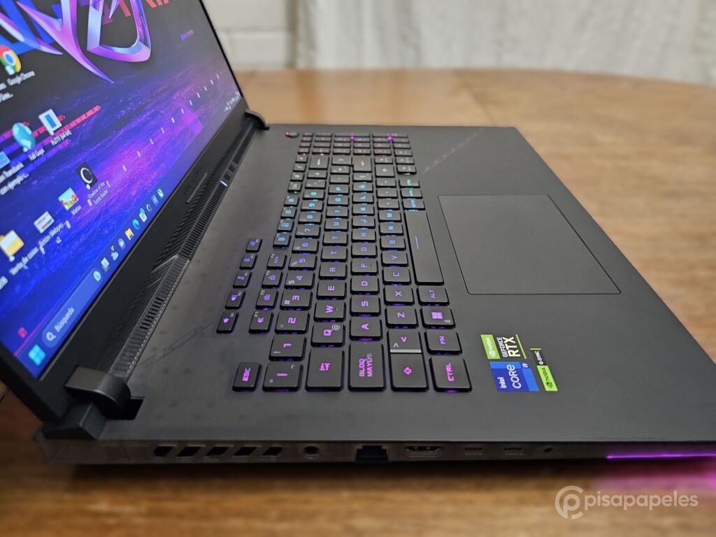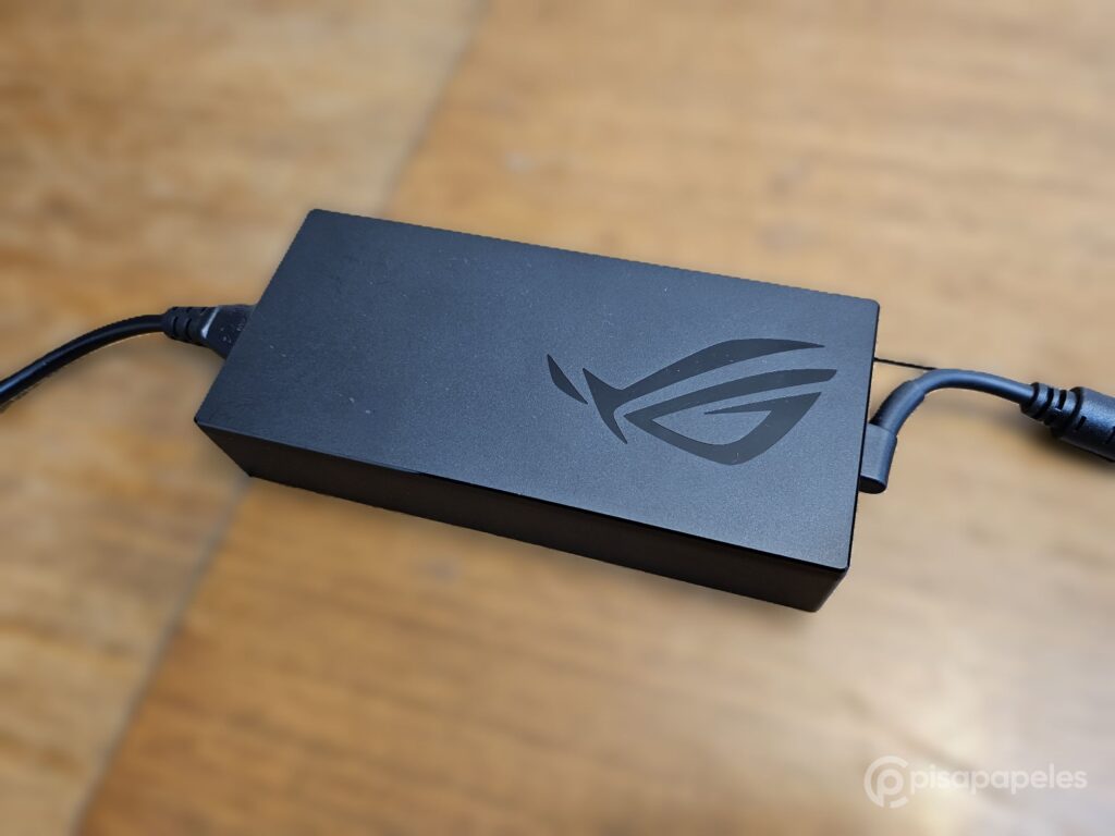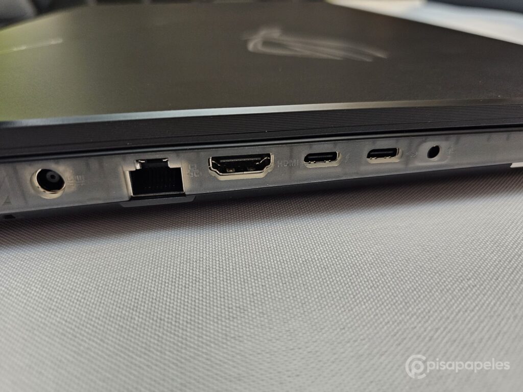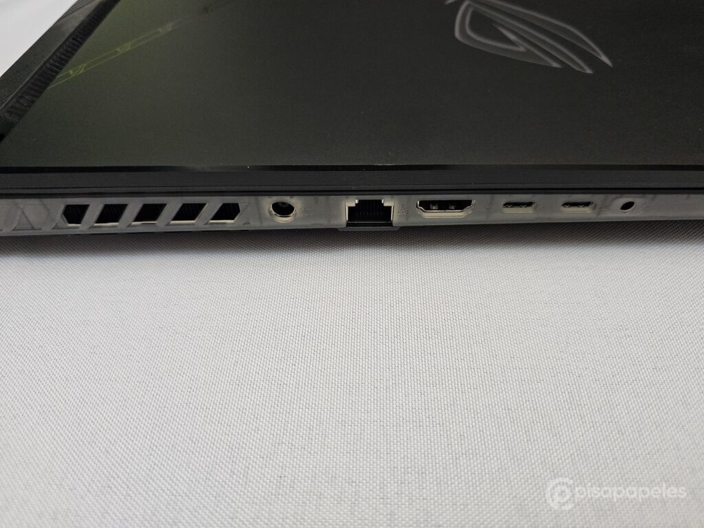 Si nos desplazamos a la parte izquierda, acá hallamos un combo Jack de 3.5mm para audio y micrófono. Seguido de un puerto USB-C Thunderbolt 4 con soporte de DisplayPort (DP), G-Sync y Power Delivery (PD). Luego tenemos otro puerto USB tipo C 3.2 Gen 2 compatible también con DP y PD, seguido de un HDMI 2.1, un puerto LAN de 2.5 Gbps y el conector de carga propietario de ASUS para el transformador de 330W.