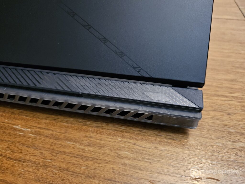 A primera vista el portátil es gigante con su pantalla de 18 pulgadas. Pero este es el formato escogido por ASUS para su portátil. Aun así, el equipo tiene un diseño futurista muy al estilo cyberpunk, con líneas que rompen los esquemas y una cubierta transparente que acentúa más el diseño gamer del portátil. Del mismo modo, una de las cosas que llama nuestra atención es la franja de iluminación LED, la que suma otro toque gamer al notebook. Por lo que en lo que respecta al diseño, el equipo tiene un aspecto muy agradable visualmente.